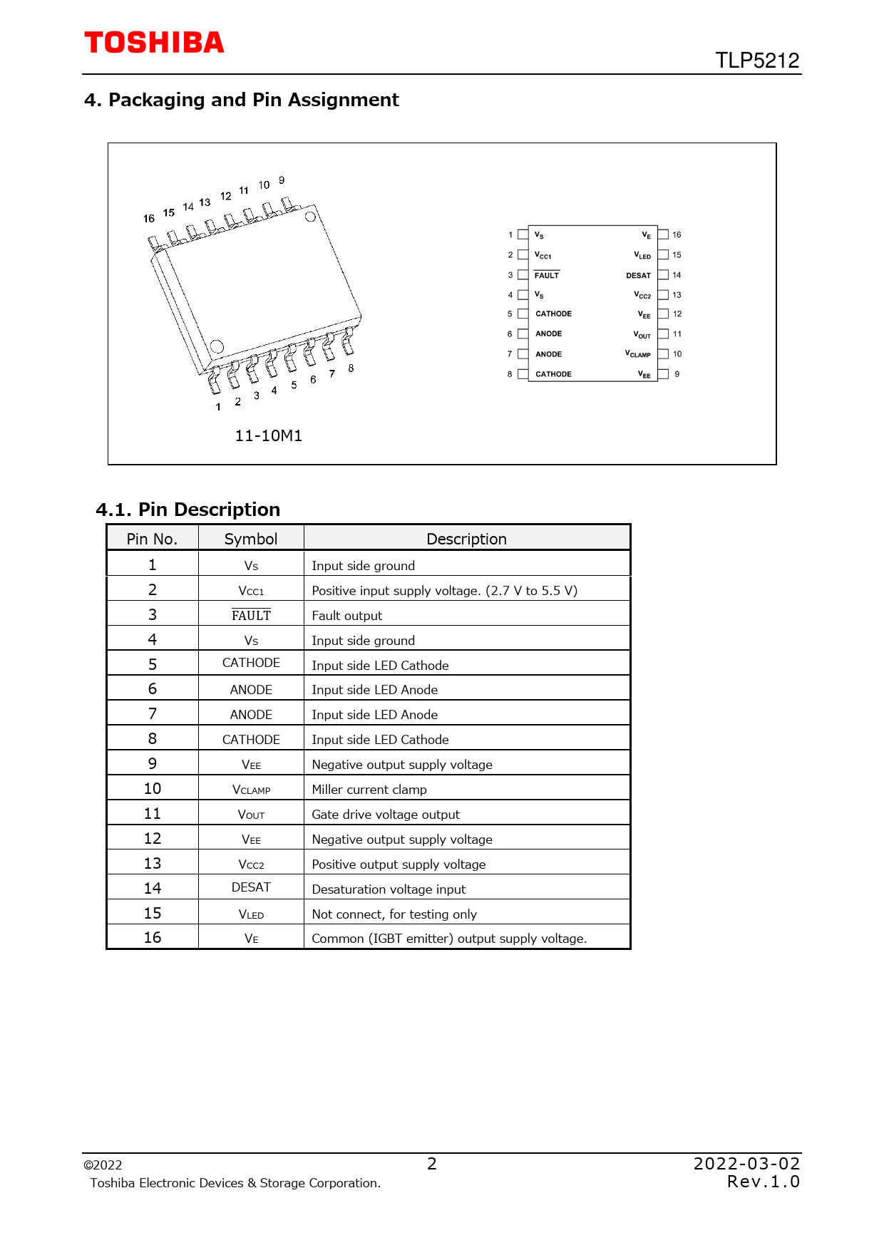 Pin No. Symbol Description 1 VS Input side ground 2 VCC1 Positive input supply voltage. (2.7 V to 5.5 V) 3 FAULT Fault output 4 VS Input side ground 5 CATHODE Input side LED Cathode 6 ANODE Input side LED Anode 7 ANODE Input side LED Anode 8 CATHODE Input side LED Cathode 9 VEE Negative output supply voltage 10 VCLAMP Miller current clamp 11 VOUT Gate drive voltage output 12 VEE Negative output supply voltage 13 VCC2 Positive output supply voltage 14 DESAT Desaturation voltage input 15 VLED Not connect, for testing only 16 VE Common (IGBT emitter) output supply voltage. ©2022 2 2022-03-02 Toshiba Electronic Devices & Storage Corporation. Rev.1.0