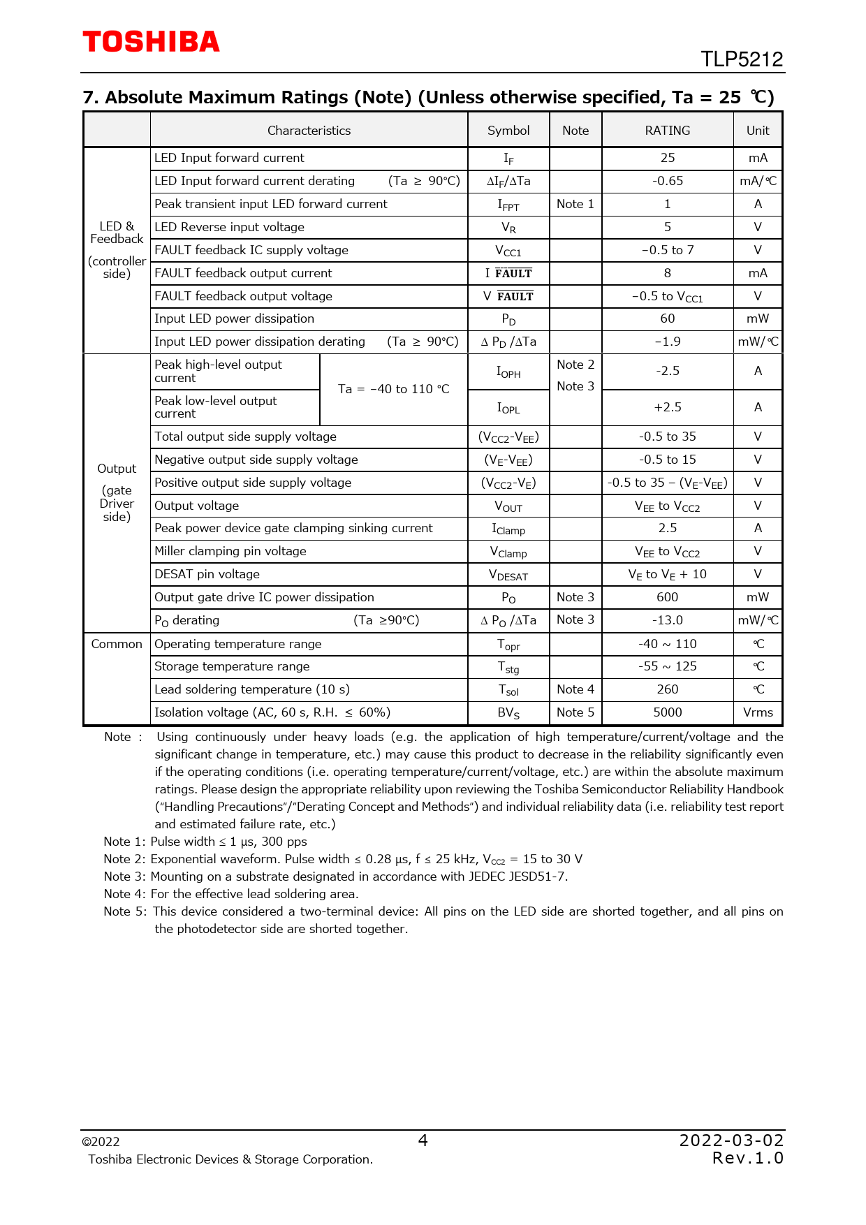 Characteristics Symbol Note RATING Unit LED Input forward current IF 25 mA LED Input forward current derating (Ta ≥ 90°C) ∆IF/∆Ta -0.65 mA/°C Peak transient input LED forward current IFPT Note 1 1 A LED & LED Reverse input voltage VR 5 V Feedback FAULT feedback IC supply voltage V (control er CC1 −0.5 to 7 V side) FAULT feedback output current I 𝐅𝐅�𝐅𝐅𝐅𝐅 ���� 𝐅𝐅 �� 𝐅𝐅 ��� 8 mA FAULT feedback output voltage V 𝐅𝐅�𝐅𝐅𝐅𝐅 ���� 𝐅𝐅 �� 𝐅𝐅 ��� −0.5 to VCC1 V Input LED power dissipation PD 60 mW Input LED power dissipation derating (Ta ≥ 90°C) ∆ PD /∆Ta −1.9 mW/°C Peak high-level output current IOPH Note 2 -2.5 A Ta = −40 to 110 °C Note 3 Peak low-level output current IOPL +2.5 A Total output side supply voltage (VCC2-VEE) -0.5 to 35 V Negative output side supply voltage (V Output E-VEE) -0.5 to 15 V (gate Positive output side supply voltage (VCC2-VE) -0.5 to 35 − (VE-VEE) V Driver Output voltage V side) OUT VEE to VCC2 V Peak power device gate clamping sinking current IClamp 2.5 A Miller clamping pin voltage VClamp VEE to VCC2 V DESAT pin voltage VDESAT VE to VE + 10 V Output gate drive IC power dissipation PO Note 3 600 mW PO derating (Ta ≥90°C) ∆ PO /∆Ta Note 3 -13.0 mW/°C Common Operating temperature range Topr -40 ~ 110 °C Storage temperature range Tstg -55 ~ 125 °C Lead soldering temperature (10 s) Tsol Note 4 260 °C Isolation voltage (AC, 60 s, R.H. ≤ 60%) BVS Note 5 5000 Vrms Note : Using continuously under heavy loads (e.g. the application of high temperature/current/voltage and the significant change in temperature, etc.) may cause this product to decrease in the reliability significantly even if the operating conditions (i.e. operating temperature/current/voltage, etc.) are within the absolute maximum ratings. Please design the appropriate reliability upon reviewing the Toshiba Semiconductor Reliability Handbook (“Handling Precautions”/”Derating Concept and Methods”) and individual reliability data (i.e. reliability test report and estimated failure rate, etc.) Note 1: Pulse width ≤ 1 μs, 300 pps Note 2: Exponential waveform. Pulse width ≤ 0.28 μs, f ≤ 25 kHz, VCC2 = 15 to 30 V Note 3: Mounting on a substrate designated in accordance with JEDEC JESD51-7. Note 4: For the effective lead soldering area. Note 5: This device considered a two-terminal device: All pins on the LED side are shorted together, and al pins on the photodetector side are shorted together. ©2022 4 2022-03-02 Toshiba Electronic Devices & Storage Corporation. Rev.1.0