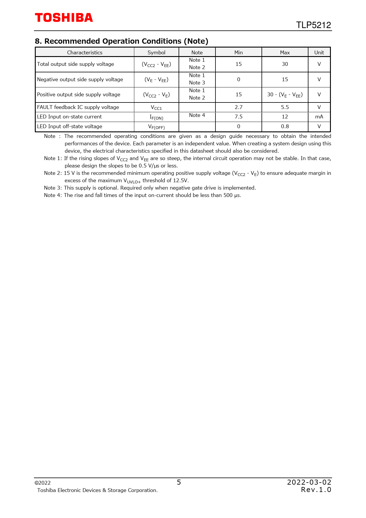 Characteristics Symbol Note Min Max Unit Note 1 Total output side supply voltage (VCC2 - VEE) Note 2 15 30 V Note 1 Negative output side supply voltage (VE - VEE) Note 3 0 15 V Note 1 Positive output side supply voltage (VCC2 - VE) Note 2 15 30 - (VE - VEE) V FAULT feedback IC supply voltage VCC1 2.7 5.5 V LED Input on-state current IF(ON) Note 4 7.5 12 mA LED Input off-state voltage VF(OFF) 0 0.8 V Note : The recommended operating conditions are given as a design guide necessary to obtain the intended performances of the device. Each parameter is an independent value. When creating a system design using this device, the electrical characteristics specified in this datasheet should also be considered. Note 1: If the rising slopes of VCC2 and VEE are so steep, the internal circuit operation may not be stable. In that case, please design the slopes to be 0.5 V/μs or less. Note 2: 15 V is the recommended minimum operating positive supply voltage (VCC2 - VE) to ensure adequate margin in excess of the maximum VUVLO+ threshold of 12.5V. Note 3: This supply is optional. Required only when negative gate drive is implemented. Note 4: The rise and fal times of the input on-current should be less than 500 μs. ©2022 5 2022-03-02 Toshiba Electronic Devices & Storage Corporation. Rev.1.0