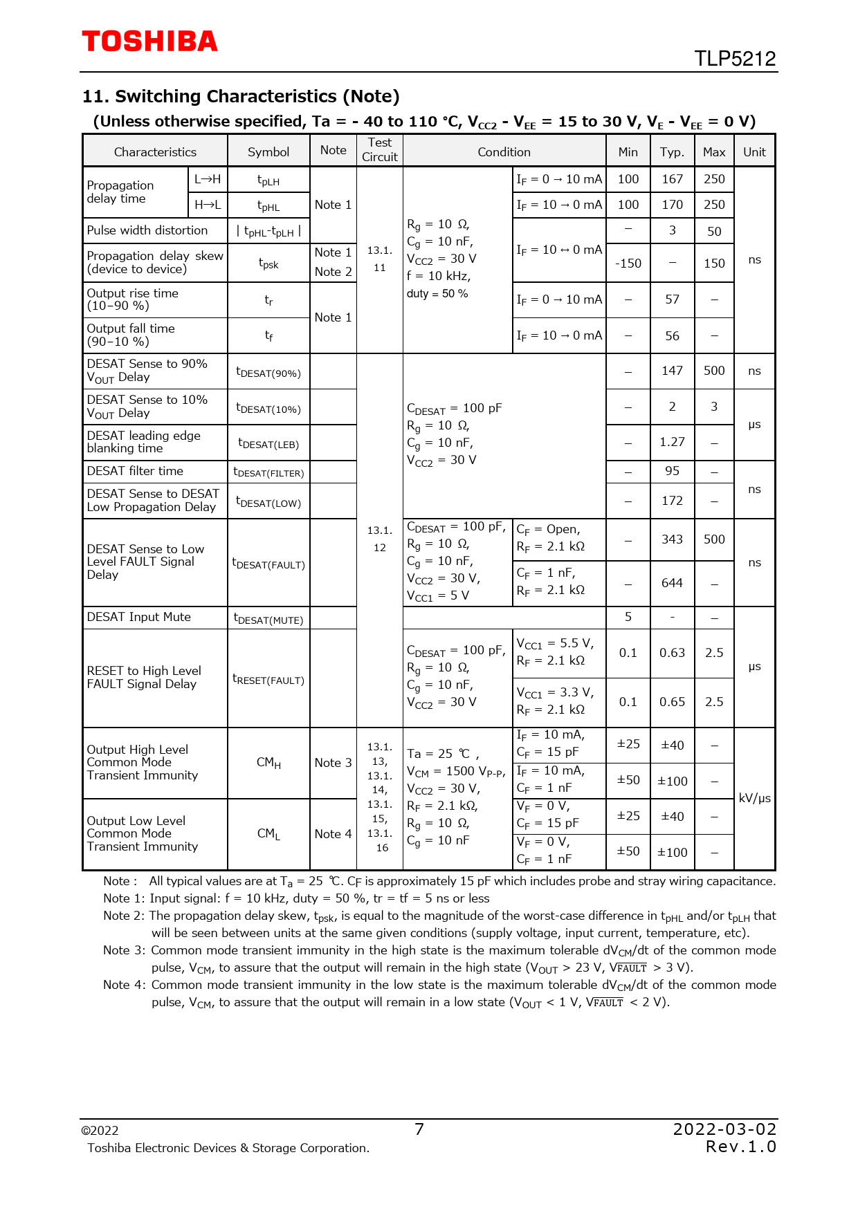 11. Switching Characteristics (Note) (Unless otherwise specified, Ta = - 40 to 110 °C, VCC2 - VEE = 15 to 30 V, VE - VEE = 0 V)