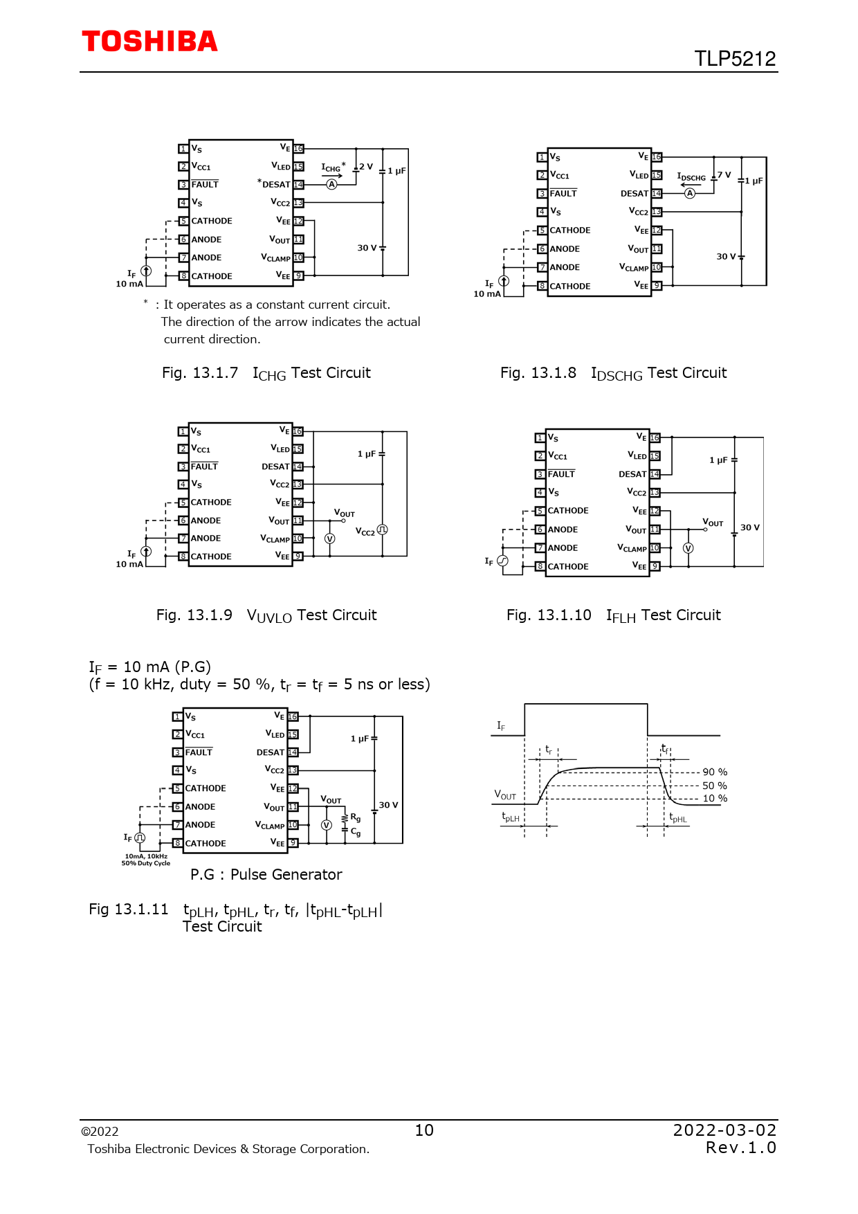 TLP5212 * : It operates as a constant current circuit. The direction of the arrow indicates the actual current direction. Fig. 13.1.7 ICHG Test Circuit Fig. 13.1.8 IDSCHG Test Circuit Fig. 13.1.9 VUVLO Test Circuit Fig. 13.1.10 IFLH Test Circuit IF = 10 mA (P.G) (f = 10 kHz, duty = 50 %, tr = tf = 5 ns or less) P.G : Pulse Generator Fig 13.1.11 tpLH, tpHL, tr, tf, |tpHL-tpLH| Test Circuit ©2022 10 2022-03-02 Toshiba Electronic Devices & Storage Corporation. Rev.1.0