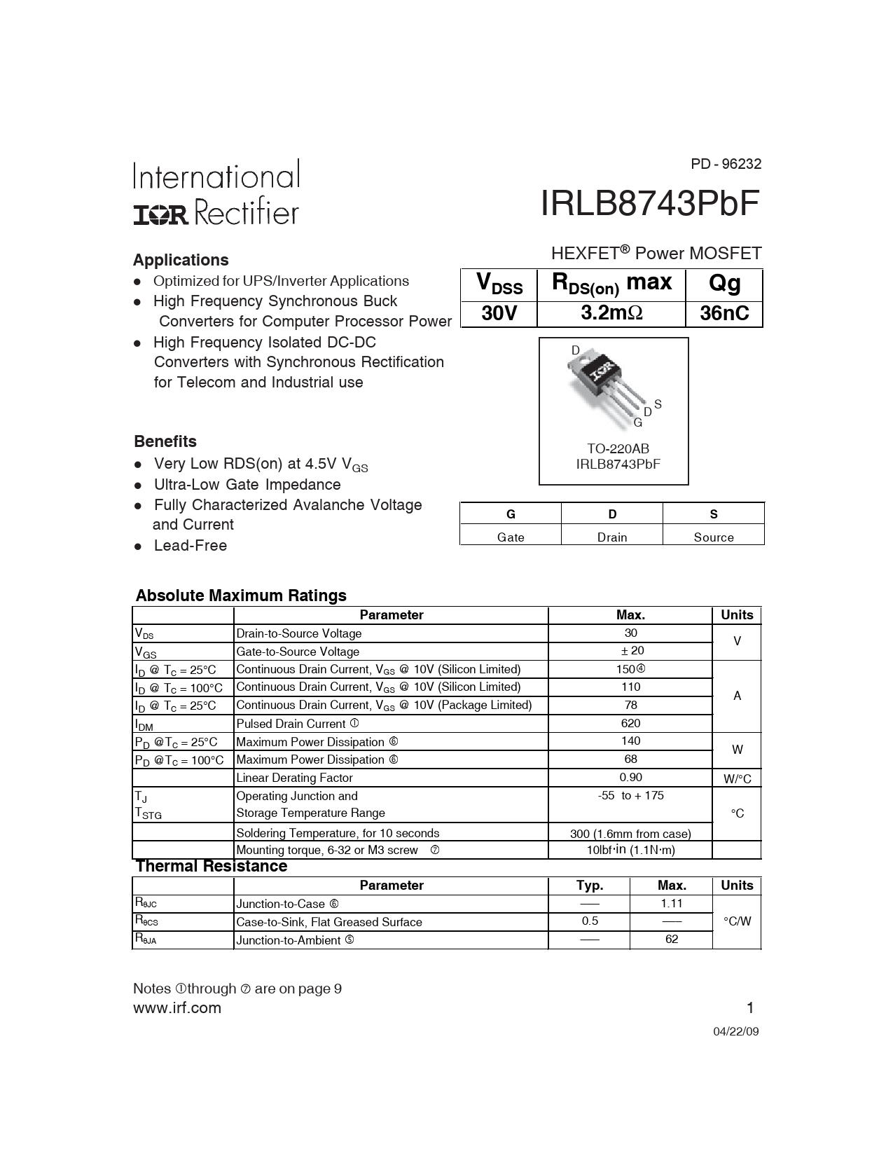PD - 96232 IRLB8743PbF HEXFET®