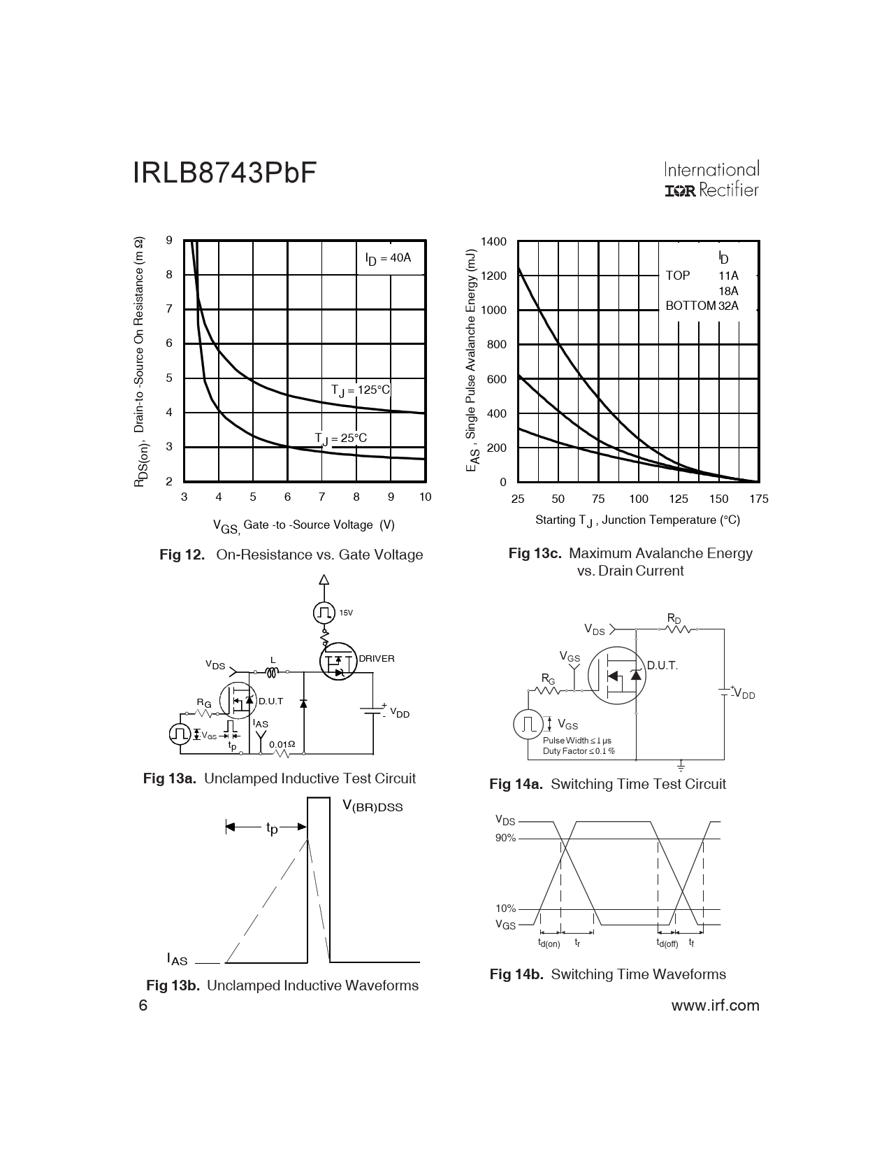 IRLB8743PbF ) 9 Ω 1400 ) m( J I ID = 40A D e m( c 8 y 1200 TOP 11A na g t r 18A si e s n 7 BOTTOM 32A e E 1000 R e n hc O 6 n e a 800 l cr a u v o A 5 S e - 600 sl o T t J = 125°C u - P n i 4 e a l 400 r g D n i , S ) T 3 J = 25°C , n 200 o S ( A S E DR 2 0 3 4 5 6 7 8 9 10 25 50 75 100 125 150 175 V Starting T GS, Gate -to -Source Voltage (V) J , Junction Temperature (°C) Fig 12. On-Resistance vs. Gate Voltage Fig 13c. Maximum Avalanche Energy vs. Drain Current 15V R V D DS L DRIVER V V GS DS D.U.T. RG +-VDD RG D.U.T + - VDD IAS A VGS 20V VGS t 0.01 Pulse Width ≤ 1 µs p Ω Duty Factor ≤ 0.1 % Fig 13a. Unclamped Inductive Test Circuit Fig 14a. Switching Time Test Circuit V(BR)DSS V tp DS 90% 10% VGS td(on) tr td(off) tf IAS Fig 14b. Switching Time Waveforms Fig 13b. Unclamped Inductive Waveforms 6 www.irf.com