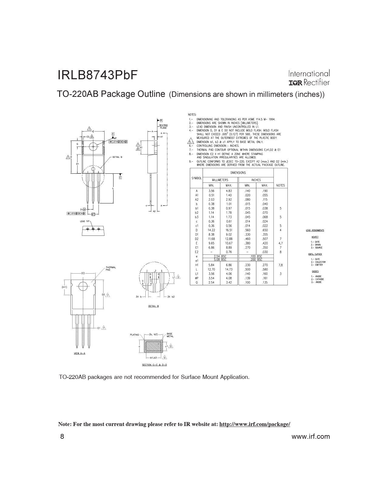 IRLB8743PbF TO-220AB Package Outline (Dimensions are shown in millimeters (inches)) TO-220AB packages are not recommended for Surface Mount Application.