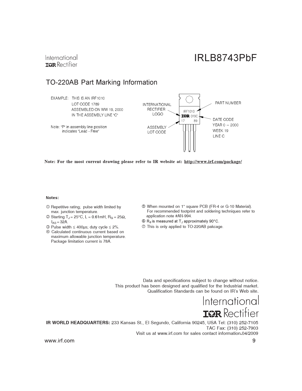 Note: For the most current drawing please refer to IR website at: http://www.irf.com/package/. Notes: