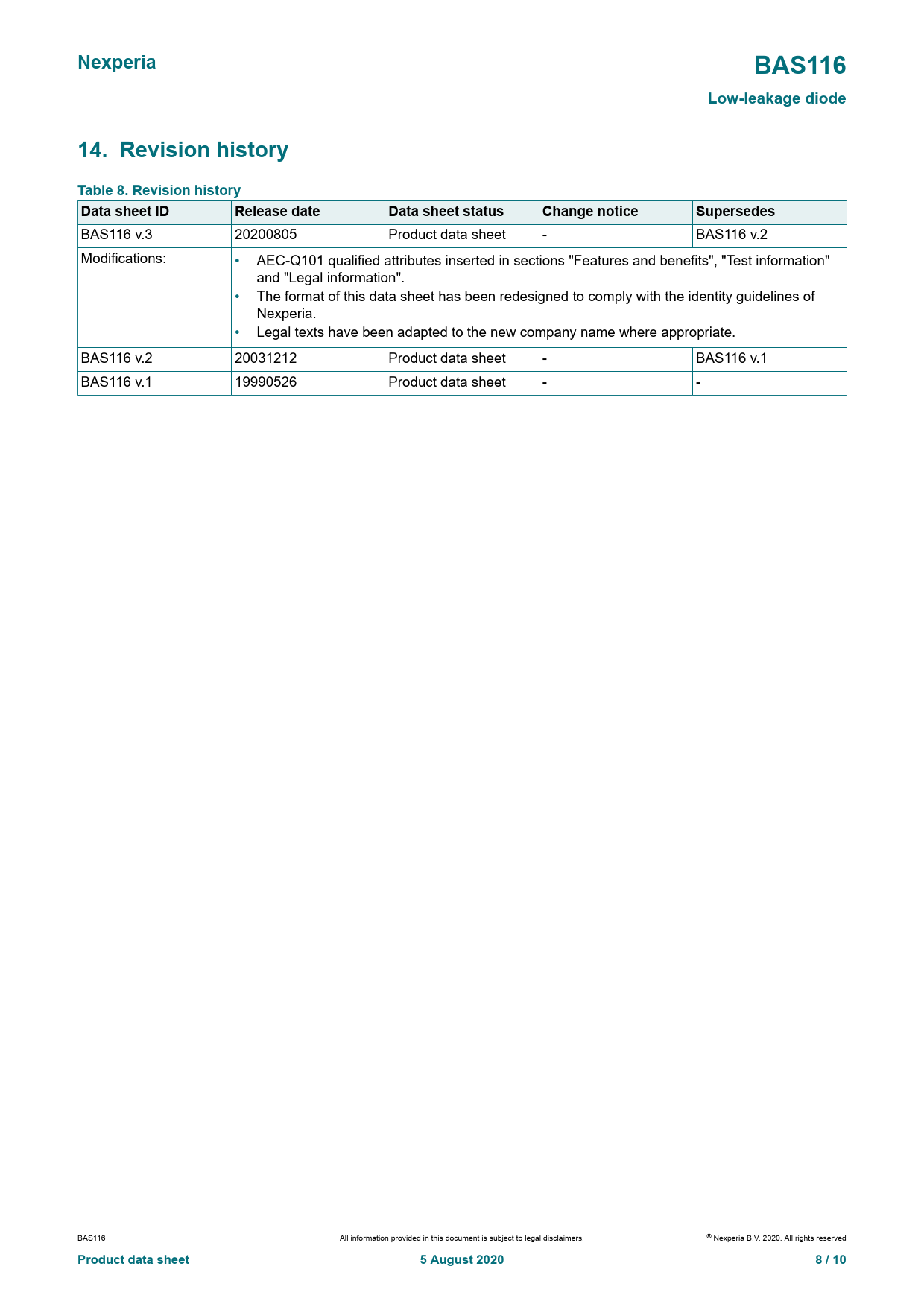 | Pages / Page | 10 / 8 — Nexperia. BAS116. Low-leakage diode. 14. Revision history Table 8. … |
