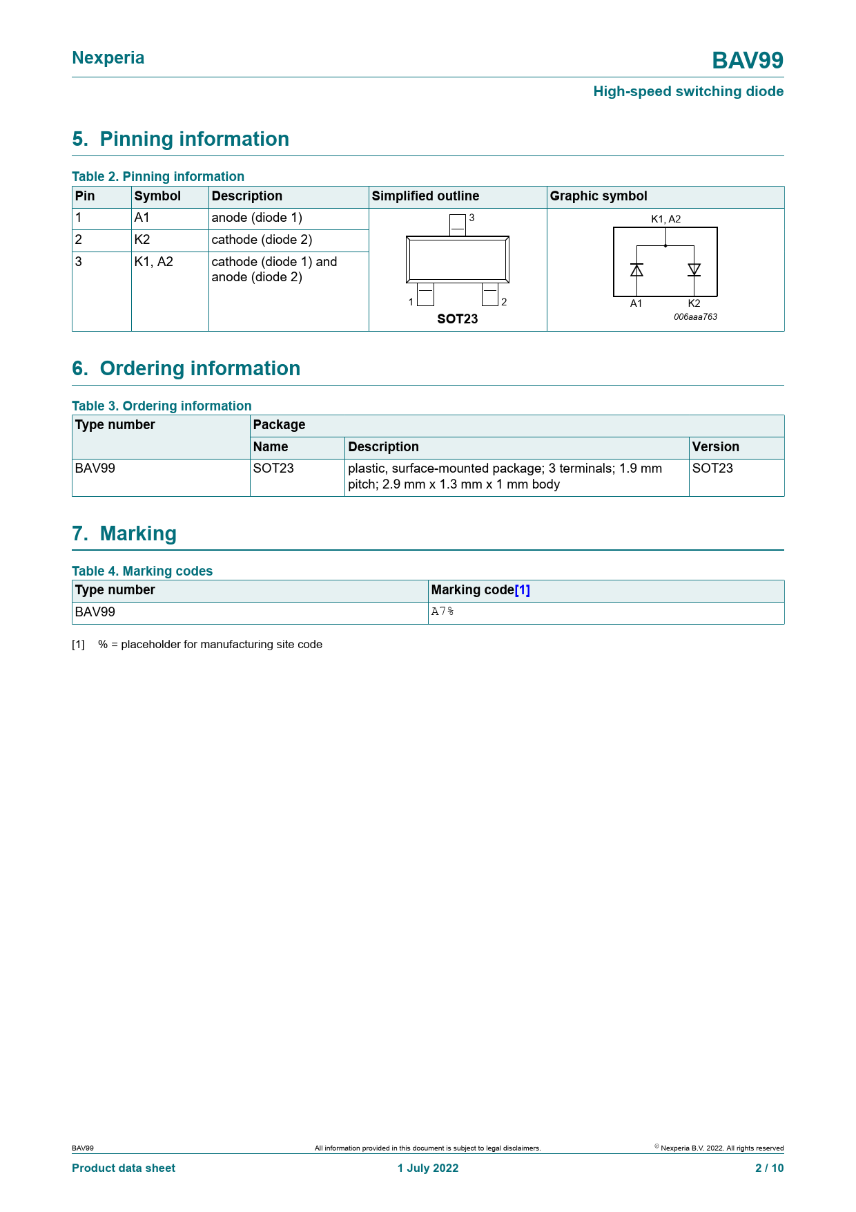 | Pages / Page | 10 / 2 — Nexperia. BAV99. High-speed switching diode. 5. Pinning information Table … |