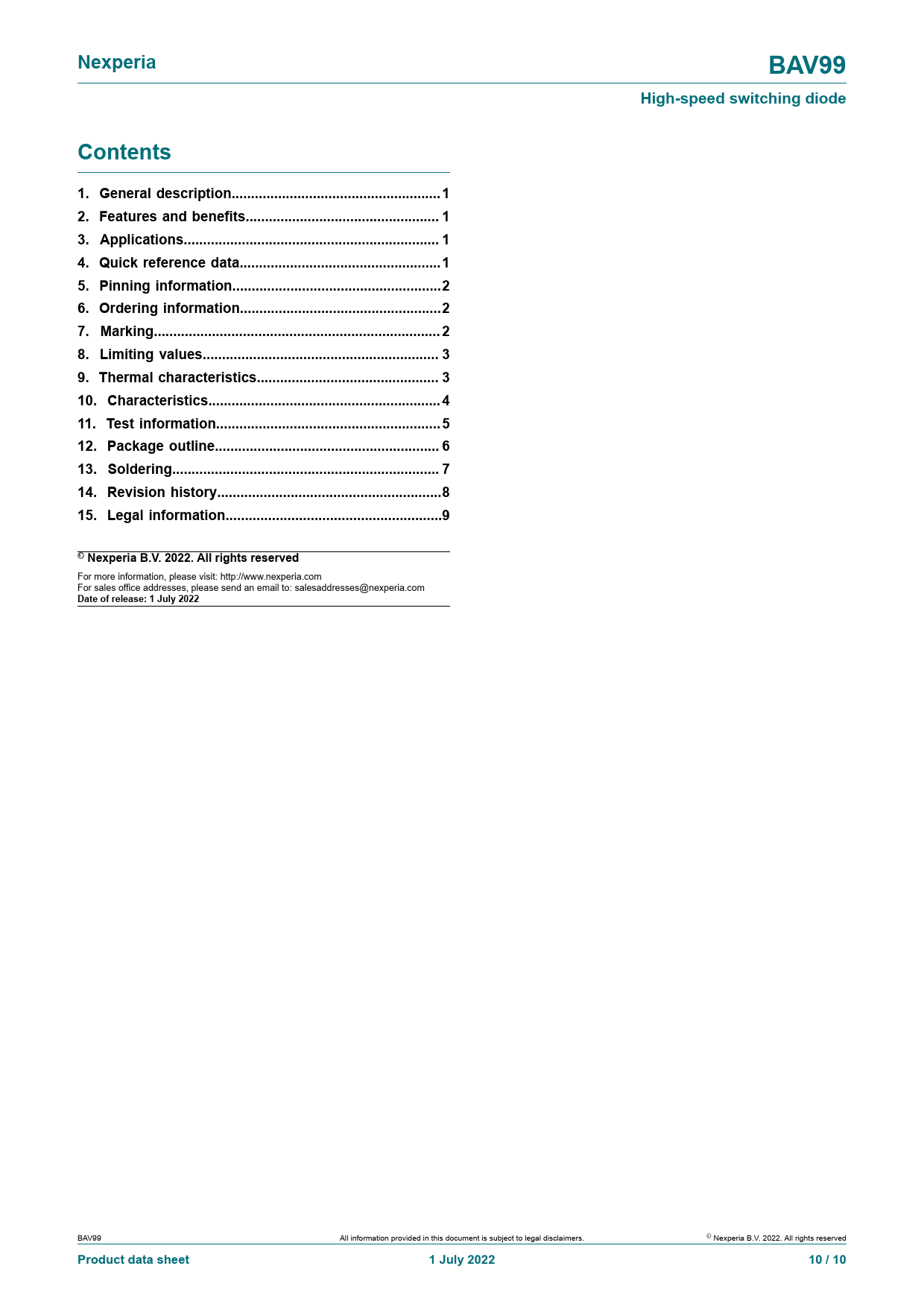| Pages / Page | 10 / 10 — Nexperia. BAV99. High-speed switching diode. Contents |