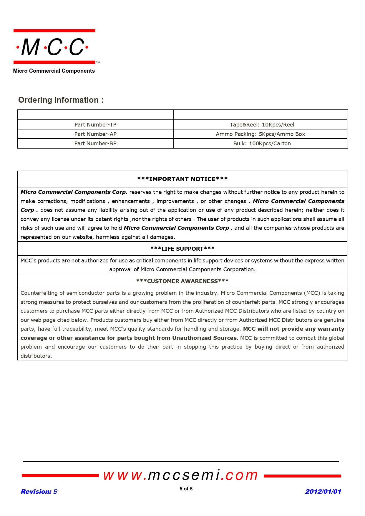 Pages / Page5 / 5 — Micro Commercial Components. Ordering Information :. ***IMPORTANT …