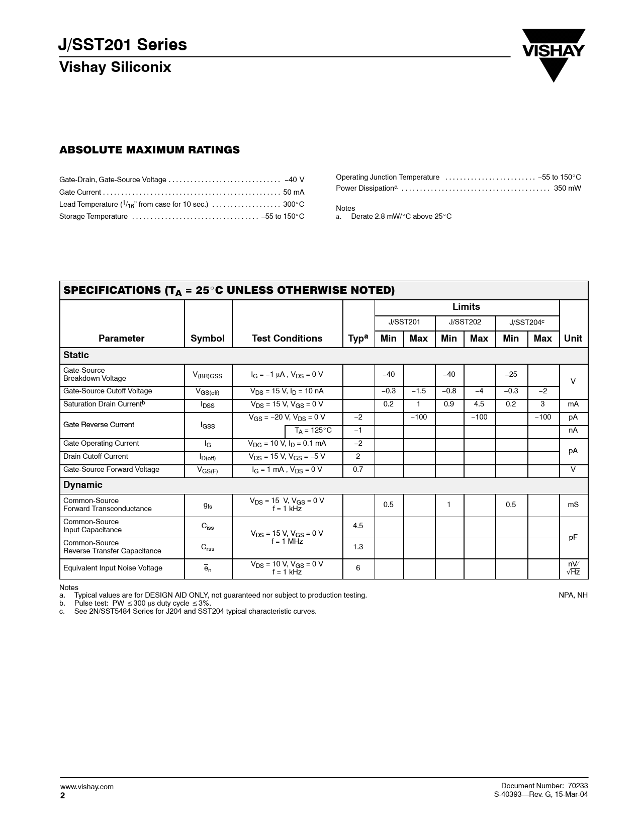 J/SST201 SeriesVishay Siliconix ABSOLUTE MAXIMUM RATINGS Gate-Drain, Gate-Source Voltage . −40 V Operating Junction Temperature . −55 to 150_C Gate Current . 50 mA Power Dissipationa . 350 mW Lead Temperature (1/16” from case for 10 sec.) . 300_C Notes Storage Temperature . −55 to 150_C a. Derate 2.8 mW/_C above 25_C SPECIFICATIONS (TA = 25_C UNLESS OTHERWISE NOTED) Limits J/SST201 J/SST202 J/SST204c ParameterSymbolTest ConditionsTypaMinMaxMinMaxMinMaxUnitStatic Gate-Source Breakdown Voltage V(BR)GSS IG = −1 mA , VDS = 0 V −40 −40 −25 V Gate-Source Cutoff Voltage VGS(off) VDS = 15 V, ID = 10 nA −0.3 −1.5 −0.8 −4 −0.3 −2 Saturation Drain Currentb IDSS VDS = 15 V, VGS = 0 V 0.2 1 0.9 4.5 0.2 3 mA VGS = −20 V, VDS = 0 V −2 −100 −100 −100 pA Gate Reverse Current IGS I S GS TA = 125_C −1 nA Gate Operating Current IG VDG = 10 V, ID = 0.1 mA −2 pA Drain Cutoff Current ID(off) VDS = 15 V, VGS = −5 V 2 Gate-Source Forward Voltage VGS(F) IG = 1 mA , VDS = 0 V 0.7 V Dynamic Common-Source VDS = 15 V, VGS = 0 V Forward Transconductance gfs f = 1 kHz 0.5 1 0.5 mS Common-Source Input Capacitance Ciss 4.5 VDS = 15 V DS , = 15 V VGS V = 0 V GS pF Common-Source f = 1 MHz Reverse Transfer Capacitance Crss 1.3 Equivalent Input Noise Voltage e VDS = 10 V, VGS = 0 V n f = 1 kHz 6 nV⁄ √Hz Notes a. Typical values are for DESIGN AID ONLY, not guaranteed nor subject to production testing. NPA, NH b. Pulse test: PW v300 ms duty cycle v3%. c. See 2N/SST5484 Series for J204 and SST204 typical characteristic curves. www.vishay.com Document Number: 70233 2 S-40393—Rev. G, 15-Mar-04