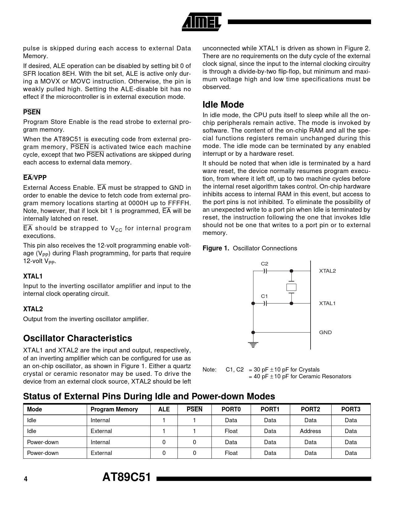 Idle Mode. PSEN. EA/VPP. Figure 1. XTAL1. XTAL2. Oscillator Characteristics. Status of External Pins During Idle and Power-down Modes