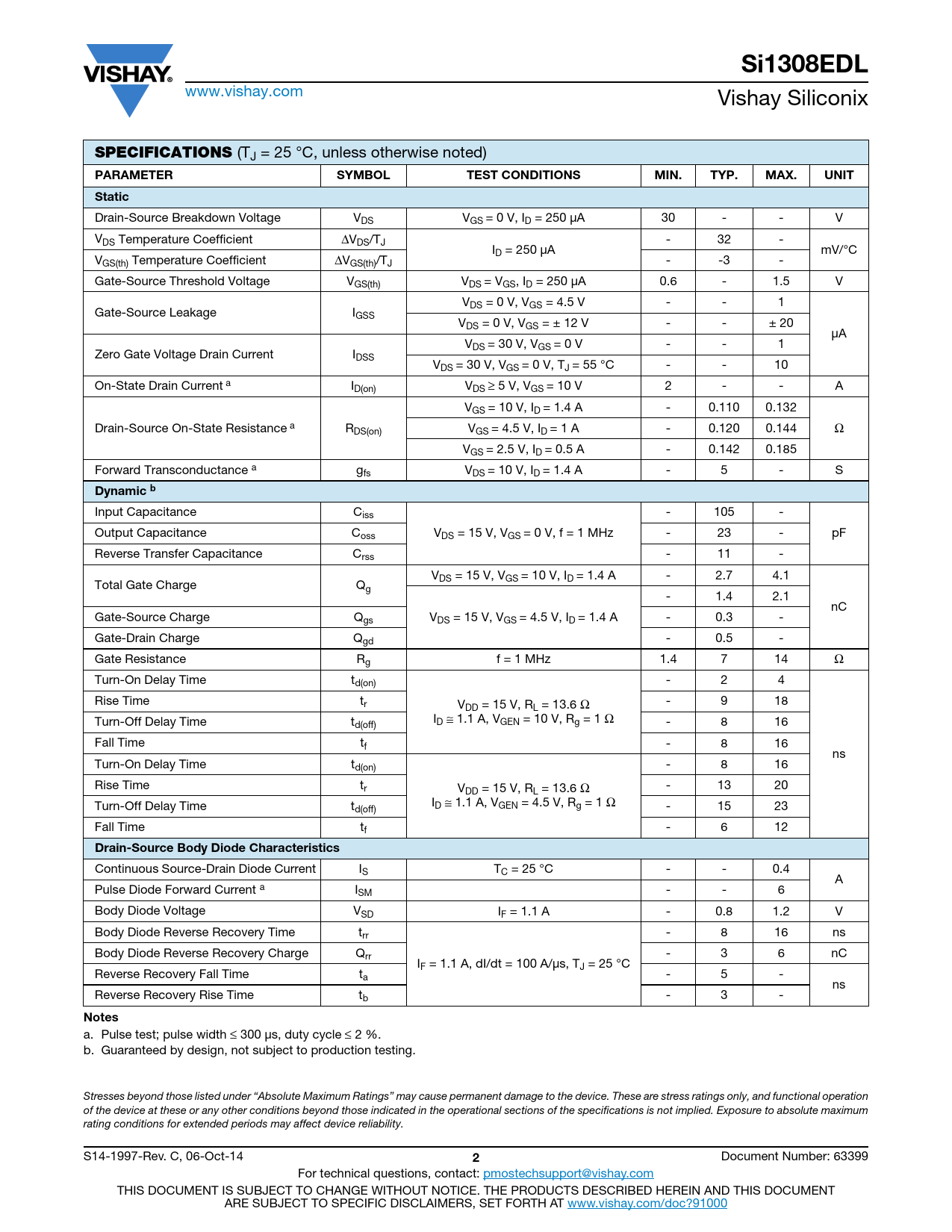 Si1308EDL www.vishay.com Vishay Siliconix SPECIFICATIONS (TJ = 25 °C, unless otherwise noted) PARAMETER SYMBOLTESTCONDITIONSMIN.TYP.MAX.UNITStatic Drain-Source Breakdown Voltage VDS VGS = 0 V, ID = 250 μA 30 - - V VDS Temperature Coefficient ΔVDS/TJ - 32 - ID = 250 μA mV/°C VGS(th) Temperature Coefficient ΔVGS(th)/TJ - -3 - Gate-Source Threshold Voltage VGS(th) VDS = VGS, ID = 250 μA 0.6 - 1.5 V VDS = 0 V, VGS = 4.5 V - - 1 Gate-Source Leakage IGSS VDS = 0 V, VGS = ± 12 V - - ± 20 μA VDS = 30 V, VGS = 0 V - - 1 Zero Gate Voltage Drain Current IDSS VDS = 30 V, VGS = 0 V, TJ = 55 °C - - 10 On-State Drain Current a ID(on) VDS ≥ 5 V, VGS = 10 V 2 - - A VGS = 10 V, ID = 1.4 A - 0.110 0.132 Drain-Source On-State Resistance a RDS(on) VGS = 4.5 V, ID = 1 A - 0.120 0.144 Ω VGS = 2.5 V, ID = 0.5 A - 0.142 0.185 Forward Transconductance a gfs VDS = 10 V, ID = 1.4 A - 5 - S Dynamic b Input Capacitance Ciss - 105 - Output Capacitance Coss VDS = 15 V, VGS = 0 V, f = 1 MHz - 23 - pF Reverse Transfer Capacitance Crss - 11 - VDS = 15 V, VGS = 10 V, ID = 1.4 A - 2.7 4.1 Total Gate Charge Qg - 1.4 2.1 nC Gate-Source Charge Qgs VDS = 15 V, VGS = 4.5 V, ID = 1.4 A - 0.3 - Gate-Drain Charge Qgd - 0.5 - Gate Resistance Rg f = 1 MHz 1.4 7 14 Ω Turn-On Delay Time td(on) - 2 4 Rise Time tr V - 9 18 DD = 15 V, RL = 13.6 Ω I Turn-Off Delay Time t D ≅ 1.1 A, VGEN = 10 V, Rg = 1 Ω d(off) - 8 16 Fall Time tf - 8 16 ns Turn-On Delay Time td(on) - 8 16 Rise Time tr V - 13 20 DD = 15 V, RL = 13.6 Ω I Turn-Off Delay Time t D ≅ 1.1 A, VGEN = 4.5 V, Rg = 1 Ω d(off) - 15 23 Fall Time tf - 6 12 Drain-Source Body Diode Characteristics Continuous Source-Drain Diode Current IS TC = 25 °C - - 0.4 A Pulse Diode Forward Current a ISM - - 6 Body Diode Voltage VSD IF = 1.1 A - 0.8 1.2 V Body Diode Reverse Recovery Time trr - 8 16 ns Body Diode Reverse Recovery Charge Qrr - 3 6 nC IF = 1.1 A, dI/dt = 100 A/μs, TJ = 25 °C Reverse Recovery Fall Time ta - 5 - ns Reverse Recovery Rise Time tb - 3 - Notes a. Pulse test; pulse width ≤ 300 μs, duty cycle ≤ 2 %. b. Guaranteed by design, not subject to production testing. Stresses beyond those listed under “Absolute Maximum Ratings” may cause permanent damage to the device. These are stress ratings only, and functional operation of the device at these or any other conditions beyond those indicated in the operational sections of the specifications is not implied. Exposure to absolute maximum rating conditions for extended periods may affect device reliability. S14-1997-Rev. C, 06-Oct-14 2 Document Number: 63399 For technical questions, contact: pmostechsupport@vishay.com THIS DOCUMENT IS SUBJECT TO CHANGE WITHOUT NOTICE. THE PRODUCTS DESCRIBED HEREIN AND THIS DOCUMENT ARE SUBJECT TO SPECIFIC DISCLAIMERS, SET FORTH AT www.vishay.com/doc?91000