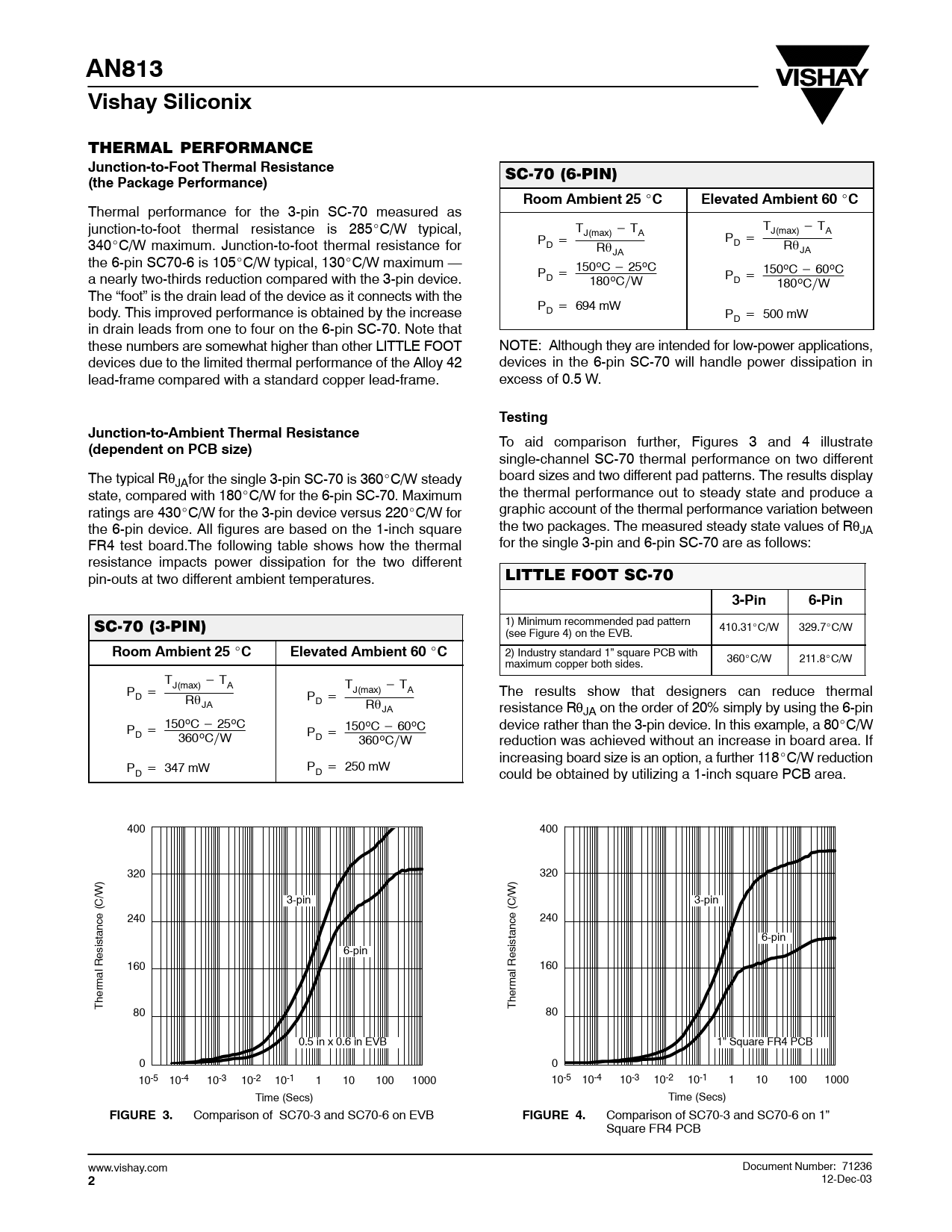 AN813Vishay Siliconix THERMAL PERFORMANCE Junction-to-Foot Thermal Resistance SC-70 (6-PIN) (the Package Performance)Room Ambient 25 _ CElevated Ambient 60 _ C Thermal performance for the 3-pin SC-70 measured as junction-to-foot thermal resistance is 285_C/W typical, T T J(max) * TA J(max) * TA 340 P _C/W maximum. Junction-to-foot thermal resistance for PD + Rq D + Rq JA JA the 6-pin SC70-6 is 105_C/W typical, 130_C/W maximum — a nearly two-thirds reduction compared with the 3-pin device. PD + 150oC * 25oC 180oCńW PD + 150oC * 60oC 180oCńW The “foot” is the drain lead of the device as it connects with the body. This improved performance is obtained by the increase PD + 694 mW PD + 500 mW in drain leads from one to four on the 6-pin SC-70. Note that these numbers are somewhat higher than other LITTLE FOOT NOTE: Although they are intended for low-power applications, devices due to the limited thermal performance of the Alloy 42 devices in the 6-pin SC-70 will handle power dissipation in lead-frame compared with a standard copper lead-frame. excess of 0.5 W. TestingJunction-to-Ambient Thermal Resistance(dependent on PCB size) To aid comparison further, Figures 3 and 4 illustrate single-channel SC-70 thermal performance on two different The typical Rθ board sizes and two different pad patterns. The results display JAfor the single 3-pin SC-70 is 360_C/W steady state, compared with 180_C/W for the 6-pin SC-70. Maximum the thermal performance out to steady state and produce a ratings are 430_C/W for the 3-pin device versus 220_C/W for graphic account of the thermal performance variation between the 6-pin device. All figures are based on the 1-inch square the two packages. The measured steady state values of RθJA FR4 test board.The following table shows how the thermal for the single 3-pin and 6-pin SC-70 are as follows: resistance impacts power dissipation for the two different pin-outs at two different ambient temperatures. LITTLE FOOT SC-70 3-Pin6-Pin SC-70 (3-PIN) 1) Minimum recommended pad pattern (see Figure 4) on the EVB. 410.31_C/W 329.7_C/W Room Ambient 25 _ CElevated Ambient 60 _ C 2) Industry standard 1” square PCB with maximum copper both sides. 360_C/W 211.8_C/W T P J(max) * TA TJ(max) * TA The results show that designers can reduce thermal D + Rq P JA D + RqJA resistance RθJA on the order of 20% simply by using the 6-pin P device rather than the 3-pin device. In this example, a 80_C/W D + 150oC * 25oC 360oCńW PD + 150oC * 60oC 360oCńW reduction was achieved without an increase in board area. If increasing board size is an option, a further 118_C/W reduction P P D + 347 mW D + 250 mW could be obtained by utilizing a 1-inch square PCB area. 400 400 320 320 3-pin 3-pin 240 240 6-pin 6-pin 160 160 Thermal Resistance (C/W) Thermal Resistance (C/W) 80 80 0.5 in x 0.6 in EVB 1” Square FR4 PCB 0 0 10-1 10-2 10-3 10-4 10-5 1 10 100 1000 10-1 10-2 10-3 10-4 10-5 1 10 100 1000 Time (Secs) Time (Secs) FIGURE 3. Comparison of SC70-3 and SC70-6 on EVB FIGURE 4. Comparison of SC70-3 and SC70-6 on 1” Square FR4 PCB www.vishay.com Document Number: 71236 2 12-Dec-03