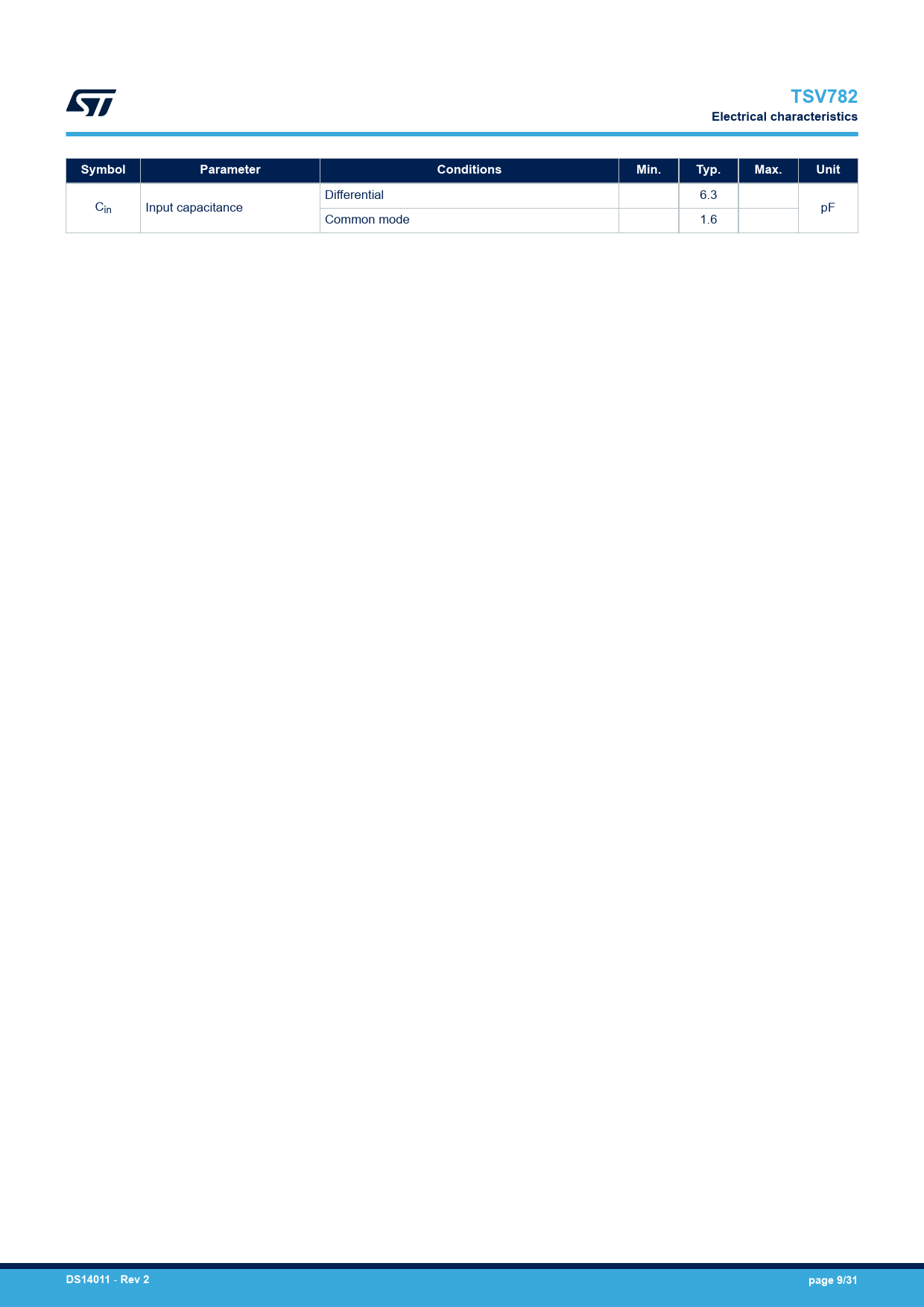 TSV782. Electrical characteristics. Symbol. Parameter. Conditions. Min. Typ. Max. Unit. DS14011. Rev 2. page 9/31
