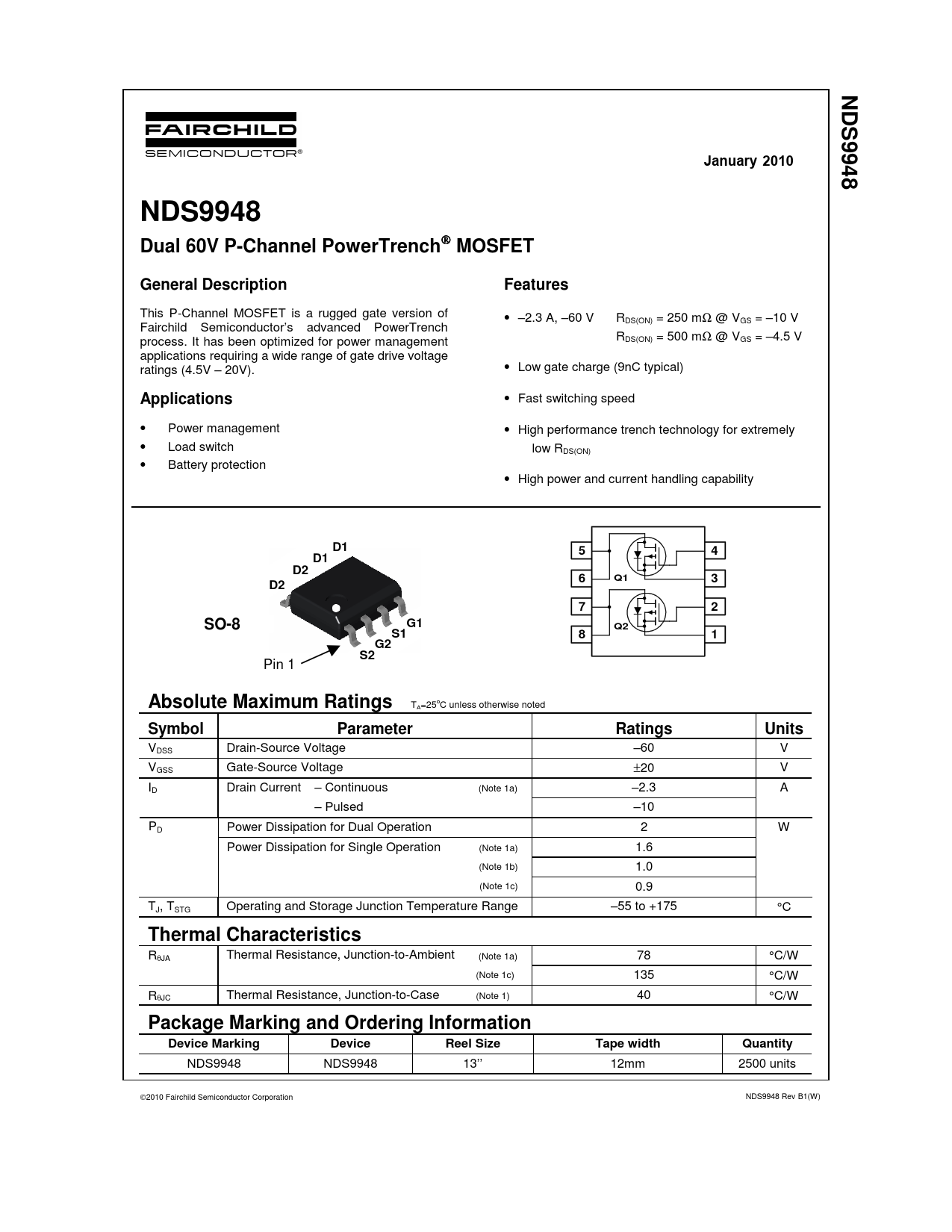 NDS9948. January 2010. NDS9948 Dual 60V P-Channel PowerTrench. MOSFET. General Description. Features. Applications. DD1. DD2. SO-8. S1 G