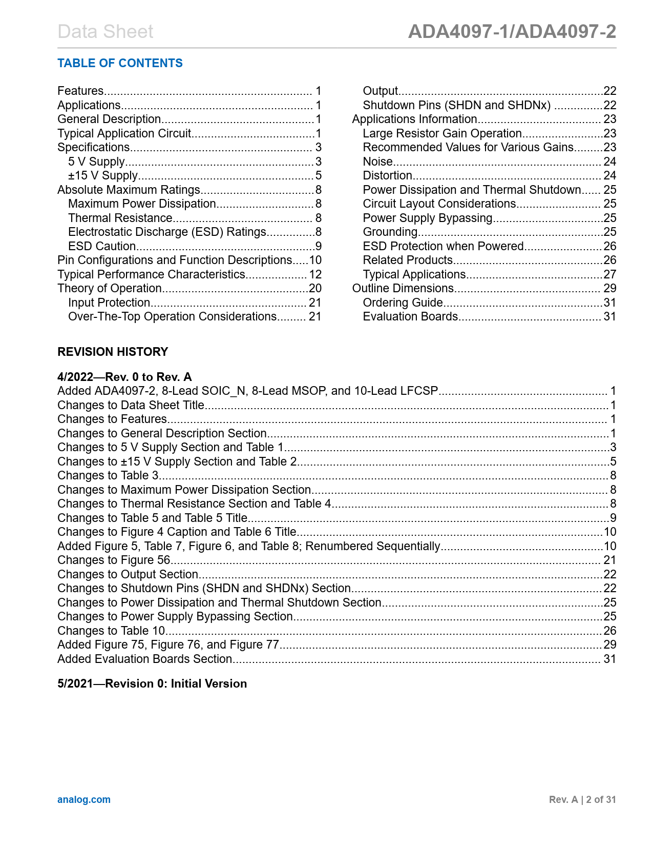 Pages / Page31 / 2 — ADA4097-1/ADA4097-2. TABLE OF CONTENTS. REVISION HISTORY. 4/2022—Rev. 0 …