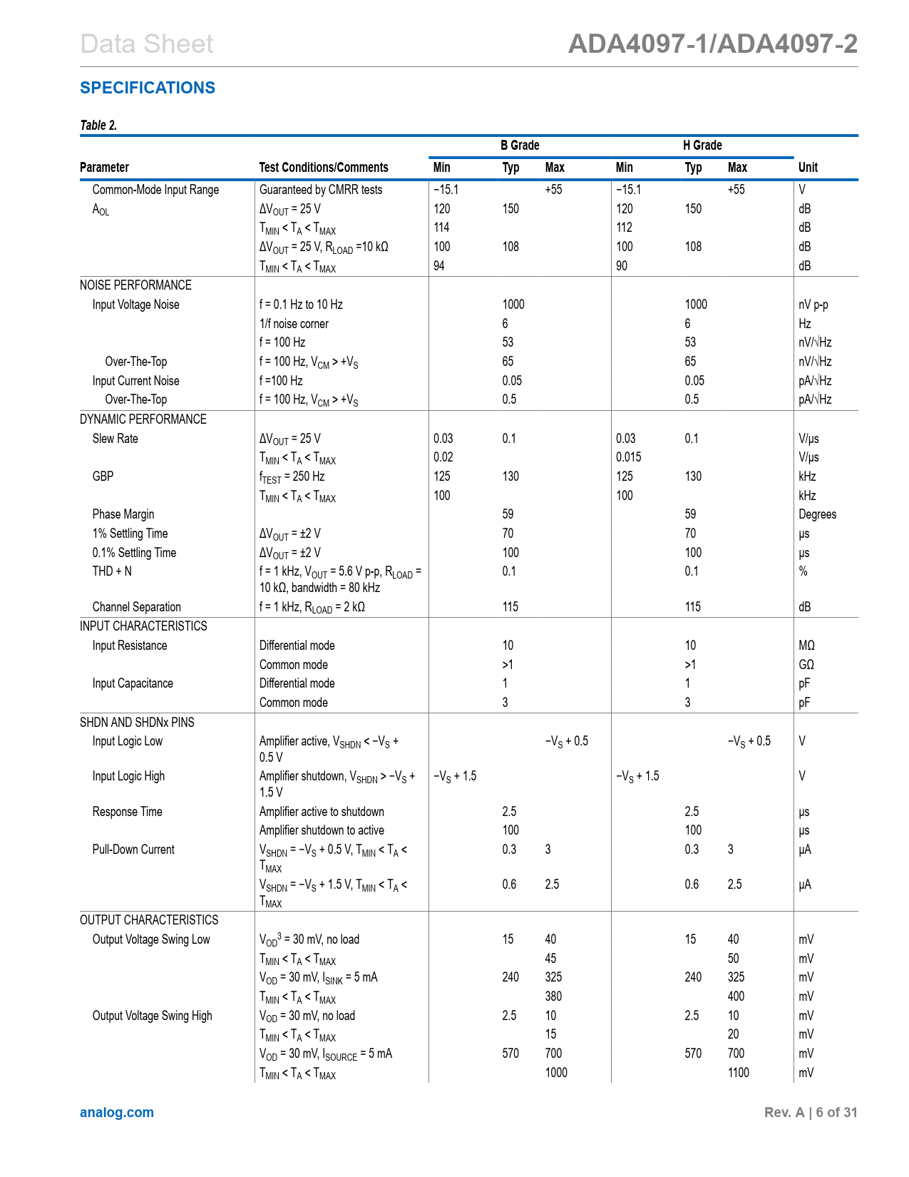 | Pages / Page | 31 / 6 — ADA4097-1/ADA4097-2. SPECIFICATIONS. Table 2. B Grade. H Grade. … |