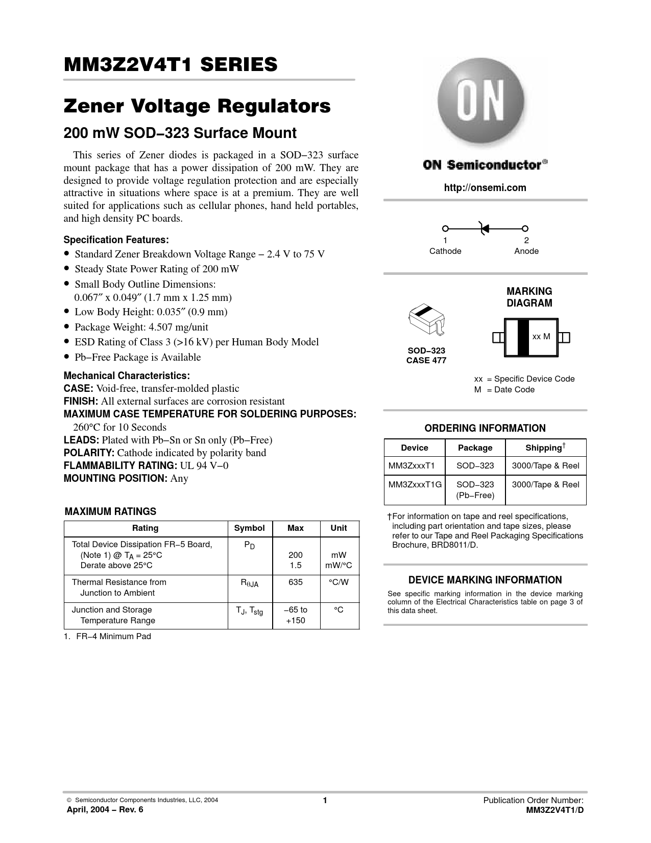 MM3Z2V4T1 SERIES Zener Voltage Regulators 200 mW SOD−323 Surface Mount This series of Zener diodes is packaged in a SOD−323 surface mount package that has a power dissipation of 200 mW. They are designed to provide voltage regulation protection and are especially http://onsemi.com attractive in situations where space is at a premium. They are well suited for applications such as cellular phones, hand held portables, and high density PC boards. Specification Features: 1 2 • Standard Zener Breakdown Voltage Range − 2.4 V to 75 V Cathode Anode • Steady State Power Rating of 200 mW • Small Body Outline Dimensions: MARKING 0.067″ x 0.049″ (1.7 mm x 1.25 mm) • DIAGRAM Low Body Height: 0.035″ (0.9 mm) • Package Weight: 4.507 mg/unit • xx M ESD Rating of Class 3 (>16 kV) per Human Body Model • SOD−323 Pb−Free Package is Available CASE 477Mechanical Characteristics: xx = Specific Device Code CASE: Void-free, transfer-molded plastic M = Date Code FINISH: All external surfaces are corrosion resistant MAXIMUM CASE TEMPERATURE FOR SOLDERING PURPOSES: 260°C for 10 Seconds ORDERING INFORMATIONLEADS: Plated with Pb−Sn or Sn only (Pb−Free) DevicePackageShippingPOLARITY: Cathode indicated by polarity band FLAMMABILITY RATING: UL 94 V−0 MM3ZxxxT1 SOD−323 3000/Tape & Reel MOUNTING POSITION: Any MM3ZxxxT1G SOD−323 3000/Tape & Reel (Pb−Free) MAXIMUM RATINGS †For information on tape and reel specifications, RatingSymbolMaxUnit including part orientation and tape sizes, please refer to our Tape and Reel Packaging Specifications Total Device Dissipation FR−5 Board, PD Brochure, BRD8011/D. (Note 1) @ TA = 25°C 200 mW Derate above 25°C 1.5 mW/°C Thermal Resistance from R DEVICE MARKING INFORMATION JA 635 °C/W Junction to Ambient See specific marking information in the device marking column of the Electrical Characteristics table on page 3 of Junction and Storage TJ, Tstg −65 to °C this data sheet. Temperature Range +150 1. FR−4 Minimum Pad Semiconductor Components Industries, LLC, 2004 1 Publication Order Number: April, 2004 − Rev. 6MM3Z2V4T1/D