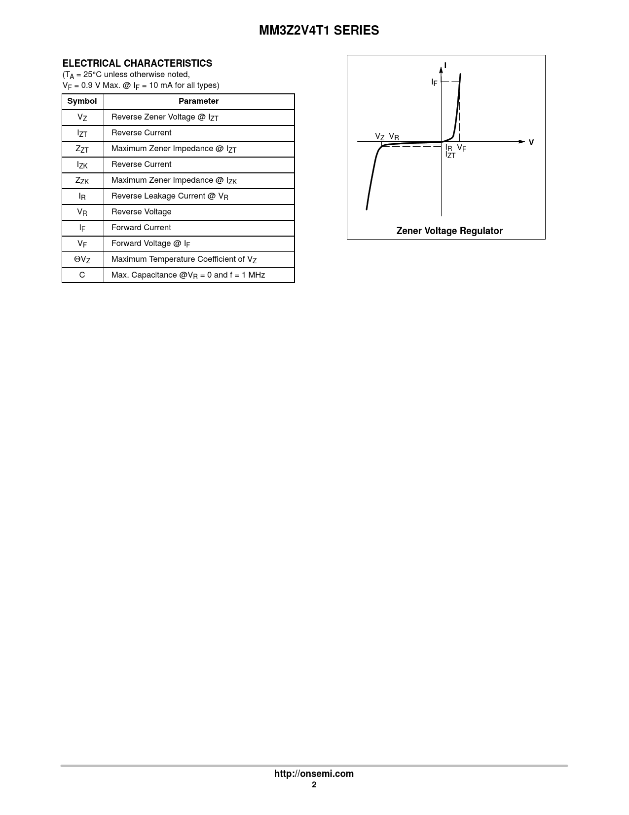 MM3Z2V4T1 SERIES ELECTRICAL CHARACTERISTICS Symbol Parameter Zener Voltage Regulator http://onsemi.com