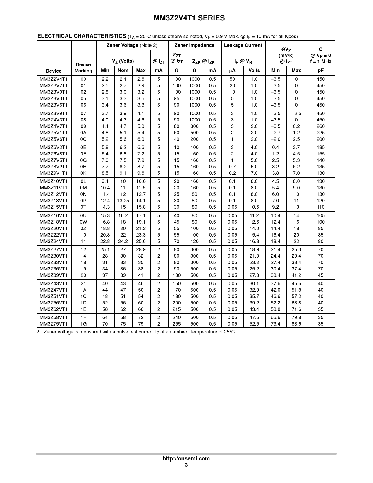 MM3Z2V4T1 00 2.2 2.4 2.6 5 100 1000 0.5 50 1.0 −3.5 0 450 MM3Z2V7T1 01 2.5 2.7 2.9 5 100 1000 0.5 20 1.0 −3.5 0 450 MM3Z3V0T1 02 2.8 3.0 3.2 5 100 1000 0.5 10 1.0 −3.5 0 450 MM3Z3V3T1 05 3.1 3.3 3.5 5 95 1000 0.5 5 1.0 −3.5 0 450 MM3Z3V6T1 06 3.4 3.6 3.8 5 90 1000 0.5 5 1.0 −3.5 0 450 MM3Z3V9T1 07 3.7 3.9 4.1 5 90 1000 0.5 3 1.0 −3.5 −2.5 450 MM3Z4V3T1 08 4.0 4.3 4.6 5 90 1000 0.5 3 1.0 −3.5 0 450 MM3Z4V7T1 09 4.4 4.7 5.0 5 80 800 0.5 3 2.0 −3.5 0.2 260 MM3Z5V1T1 0A 4.8 5.1 5.4 5 60 500 0.5 2 2.0 −2.7 1.2 225 MM3Z5V6T1 0C 5.2 5.6 6.0 5 40 200 0.5 1 2.0 −2.0 2.5 200 MM3Z6V2T1 0E 5.8 6.2 6.6 5 10 100 0.5 3 4.0 0.4 3.7 185 MM3Z6V8T1 0F 6.4 6.8 7.2 5 15 160 0.5 2 4.0 1.2 4.5 155 MM3Z7V5T1 0G 7.0 7.5 7.9 5 15 160 0.5 1 5.0 2.5 5.3 140 MM3Z8V2T1 0H 7.7 8.2 8.7 5 15 160 0.5 0.7 5.0 3.2 6.2 135 MM3Z9V1T1 0K 8.5 9.1 9.6 5 15 160 0.5 0.2 7.0 3.8 7.0 130 MM3Z10VT1 0L 9.4 10 10.6 5 20 160 0.5 0.1 8.0 4.5 8.0 130 MM3Z11VT1 0M 10.4 11 11.6 5 20 160 0.5 0.1 8.0 5.4 9.0 130 MM3Z12VT1 0N 11.4 12 12.7 5 25 80 0.5 0.1 8.0 6.0 10 130 MM3Z13VT1 0P 12.4 13.25 14.1 5 30 80 0.5 0.1 8.0 7.0 11 120 MM3Z15VT1 0T 14.3 15 15.8 5 30 80 0.5 0.05 10.5 9.2 13 110 MM3Z16VT1 0U 15.3 16.2 17.1 5 40 80 0.5 0.05 11.2 10.4 14 105 MM3Z18VT1 0W 16.8 18 19.1 5 45 80 0.5 0.05 12.6 12.4 16 100 MM3Z20VT1 0Z 18.8 20 21.2 5 55 100 0.5 0.05 14.0 14.4 18 85 MM3Z22VT1 10 20.8 22 23.3 5 55 100 0.5 0.05 15.4 16.4 20 85 MM3Z24VT1 11 22.8 24.2 25.6 5 70 120 0.5 0.05 16.8 18.4 22 80 MM3Z27VT1 12 25.1 27 28.9 2 80 300 0.5 0.05 18.9 21.4 25.3 70 MM3Z30VT1 14 28 30 32 2 80 300 0.5 0.05 21.0 24.4 29.4 70 MM3Z33VT1 18 31 33 35 2 80 300 0.5 0.05 23.2 27.4 33.4 70 MM3Z36VT1 19 34 36 38 2 90 500 0.5 0.05 25.2 30.4 37.4 70 MM3Z39VT1 20 37 39 41 2 130 500 0.5 0.05 27.3 33.4 41.2 45 MM3Z43VT1 21 40 43 46 2 150 500 0.5 0.05 30.1 37.6 46.6 40 MM3Z47VT1 1A 44 47 50 2 170 500 0.5 0.05 32.9 42.0 51.8 40 MM3Z51VT1 1C 48 51 54 2 180 500 0.5 0.05 35.7 46.6 57.2 40 MM3Z56VT1 1D 52 56 60 2 200 500 0.5 0.05 39.2 52.2 63.8 40 MM3Z62VT1 1E 58 62 66 2 215 500 0.5 0.05 43.4 58.8 71.6 35 MM3Z68VT1 1F 64 68 72 2 240 500 0.5 0.05 47.6 65.6 79.8 35 MM3Z75VT1 1G 70 75 79 2 255 500 0.5 0.05 52.5 73.4 88.6 35 2. Zener voltage is measured with a pulse test current IZ at an ambient temperature of 25°C.