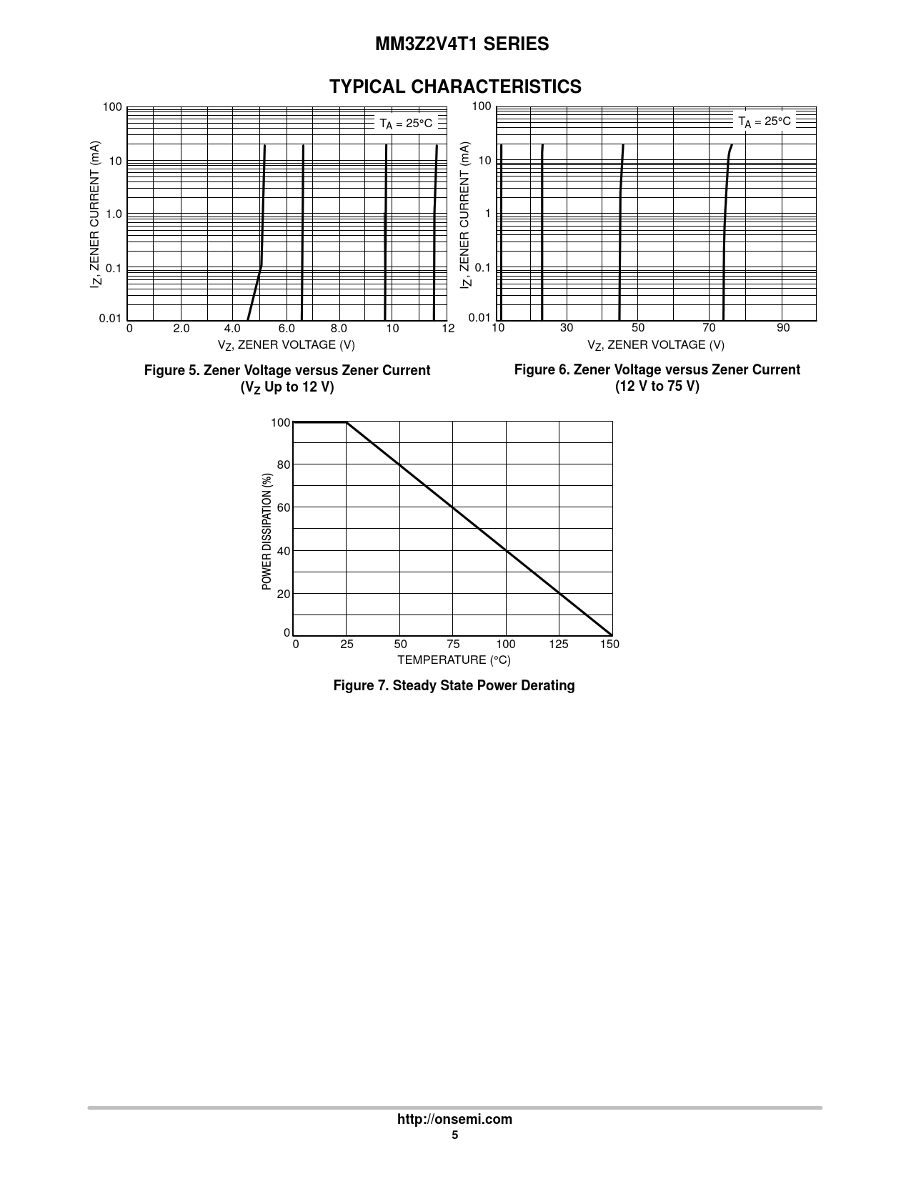 MM3Z2V4T1 SERIESTYPICAL CHARACTERISTICS 100 100 T T A = 25°C A = 25°C 10 (mA) 10 (mA) 1.0 1 0.1 0.1 , ZENER CURRENT , ZENER CURRENT I Z I Z 0.01 0.01 0 2.0 4.0 6.0 8.0 10 12 10 30 50 70 90 VZ, ZENER VOLTAGE (V) VZ, ZENER VOLTAGE (V) Figure 5. Zener Voltage versus Zener CurrentFigure 6. Zener Voltage versus Zener Current(VZ Up to 12 V)(12 V to 75 V) 100 80 ATION (%) 60 40 POWER DISSIP 20 0 0 25 50 75 100 125 150 TEMPERATURE (°C) Figure 7. Steady State Power Deratinghttp://onsemi.com5