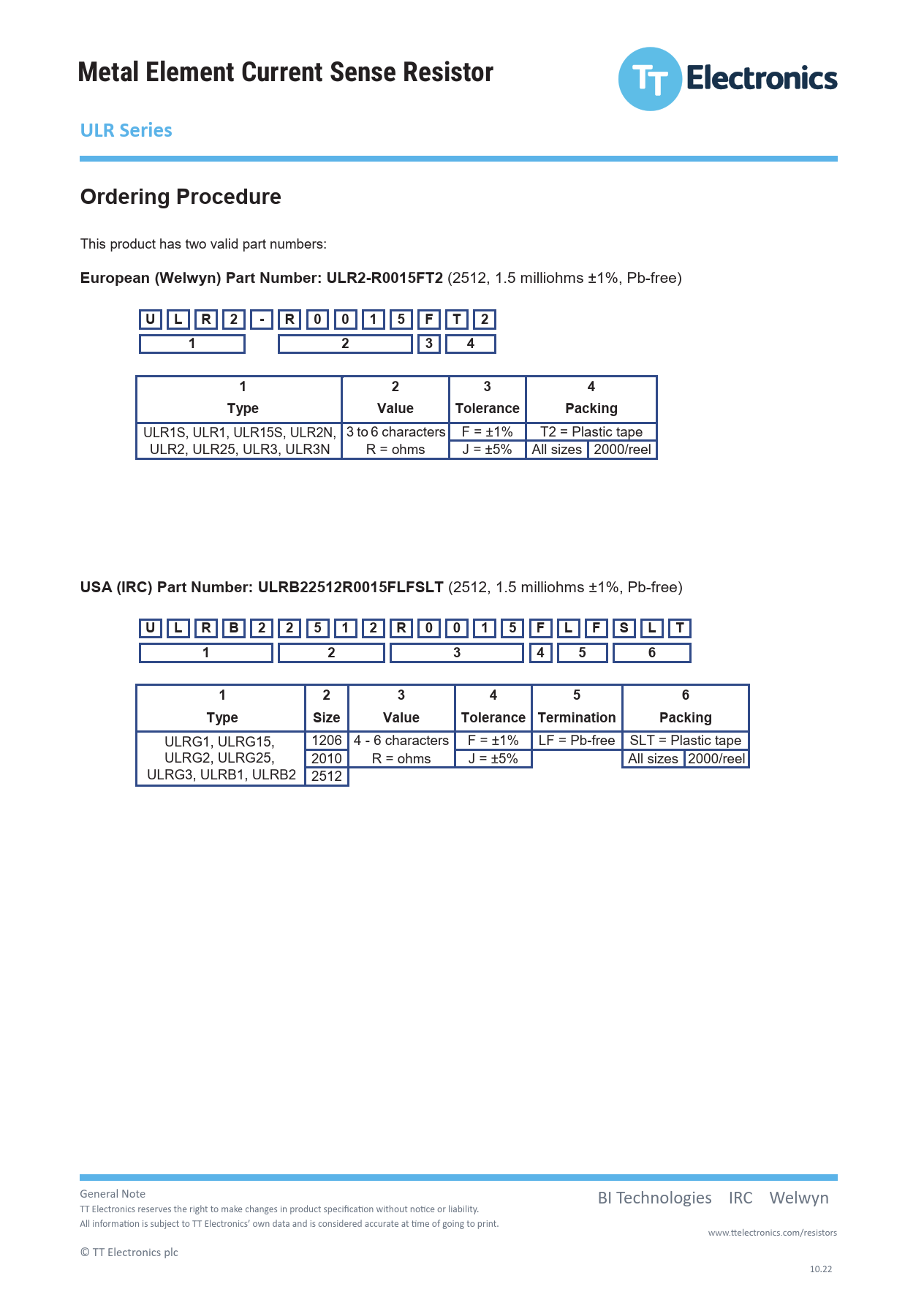 ULRG1, ULRG15, 1206 4 - 6 characters F = ±1% LF = Pb-free SLT = Plastic tape ULRG2, ULRG25, 2010 R = ohms J = ±5% Al sizes 2000/reel ULRG3, ULRB1, ULRB2 2512