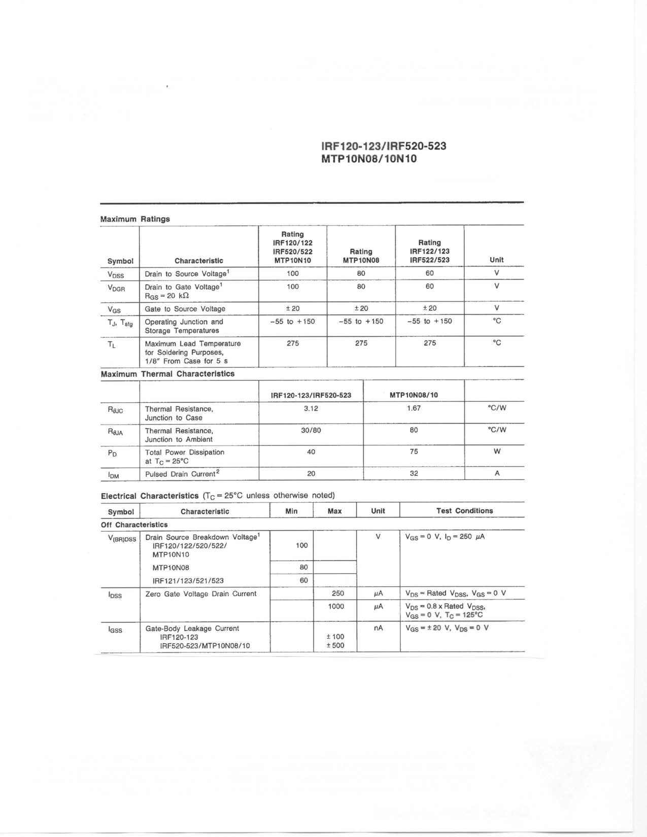 IRF120-123/IRF520-523. MTP10N08/10N10 Maximum Ratings. Rating. IRF120/122. IRF520/522. MTP10N10 Rating