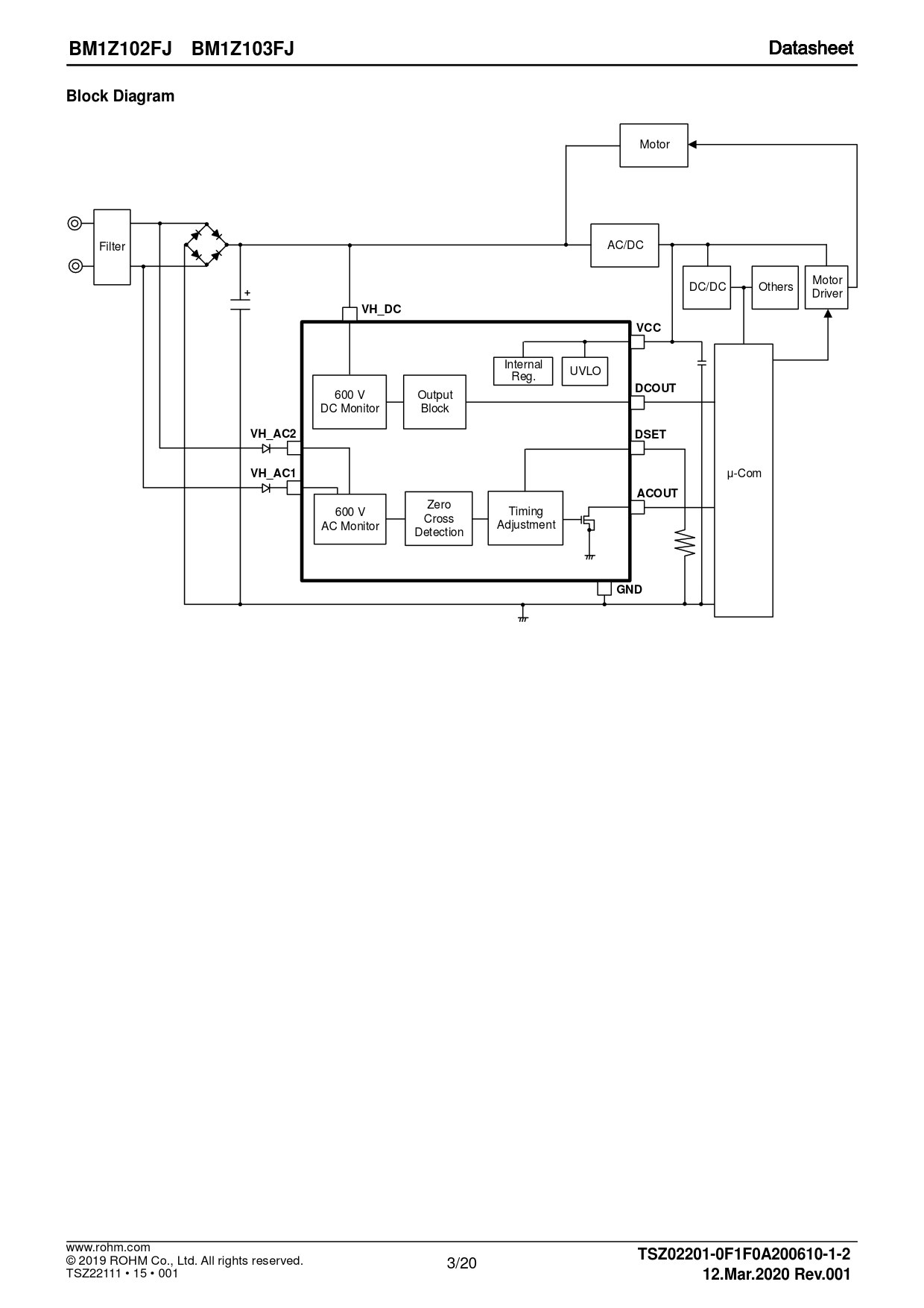 BM1Z102FJ BM1Z103FJ. Block Diagram. VH_DC. VCC. DCOUT. VH_AC2. DSET. VH_AC1. ACOUT. GND. TSZ02201-0F1F0A200610-1-2. 12.Mar.2020 Rev.00