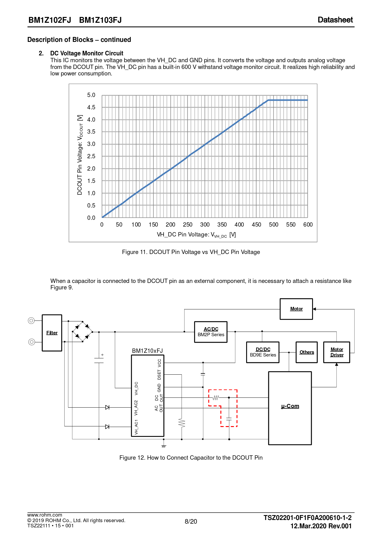 This IC monitors the voltage between the VH_DC and GND pins. It converts the voltage and outputs analog voltage from the DCOUT pin. The VH_DC pin has a built-in 600 V withstand voltage monitor circuit. It realizes high reliability and low power consumption. 5.0 4.5 ] V[ 4.0 T U O C 3.5 DV :e 3.0 g atl 2.5 o V n 2.0 Pi TU 1.5 O C D 1.0 0.5 0.0 0 50 100 150 200 250 300 350 400 450 500 550 600 VH_DC Pin Voltage: VVH_DC [V] Figure 11. DCOUT Pin Voltage vs VH_DC Pin Voltage When a capacitor is connected to the DCOUT pin as an external component, it is necessary to attach a resistance like Figure 9.