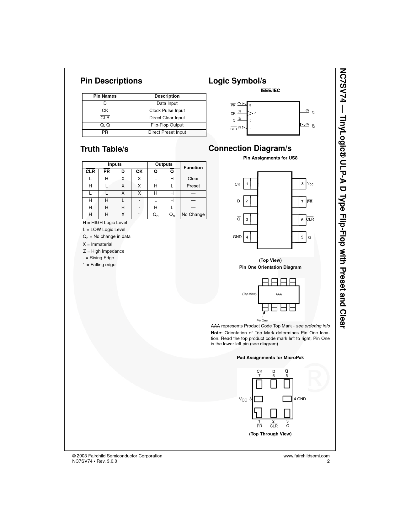 2 NC7SV74 — TinyLogic® ULP-A D Type Flip-Flop with Preset and Clear Pin Descriptions