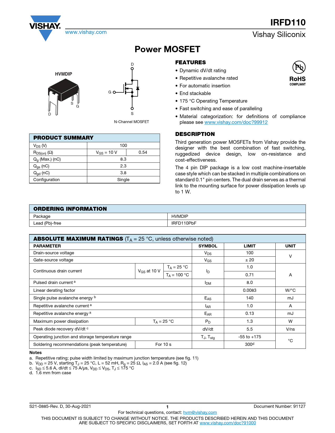 IRFD110. Power MOSFET. FEATURES. HVMDIP. DESCRIPTION. PRODUCT SUMMARY. ORDERING INFORMATION. ABSOLUTE MAXIMUM RATINGS. PARAMETER SYMBOL