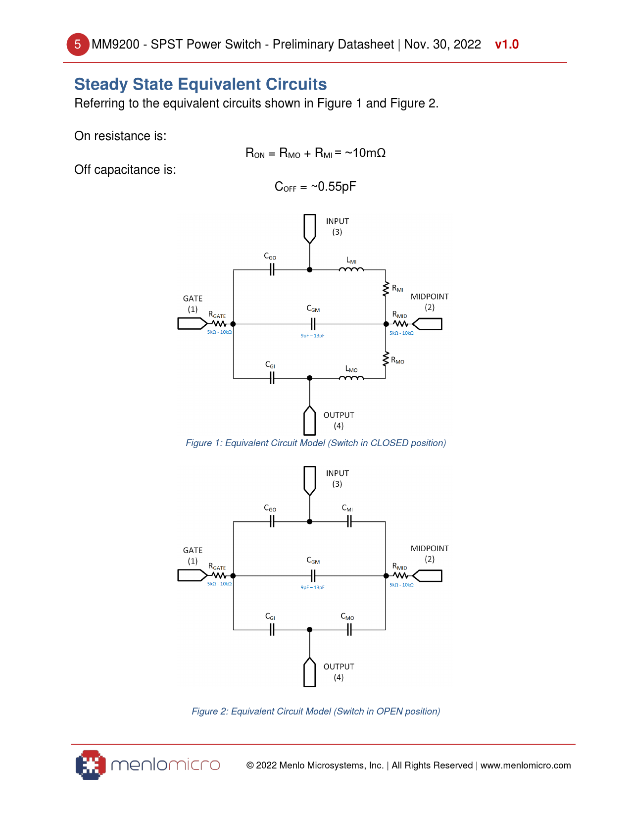 Referring to the equivalent circuits shown in Figure 1 and Figure 2. On resistance is: RON = RMO + RMI = ~10mΩ Off capacitance is: COFF = ~0.55pF Figure 1: Equivalent Circuit Model (Switch in CLOSED position) Figure 2: Equivalent Circuit Model (Switch in OPEN position) © 2022 Menlo Microsystems, Inc. | All Rights Reserved | www.menlomicro.com