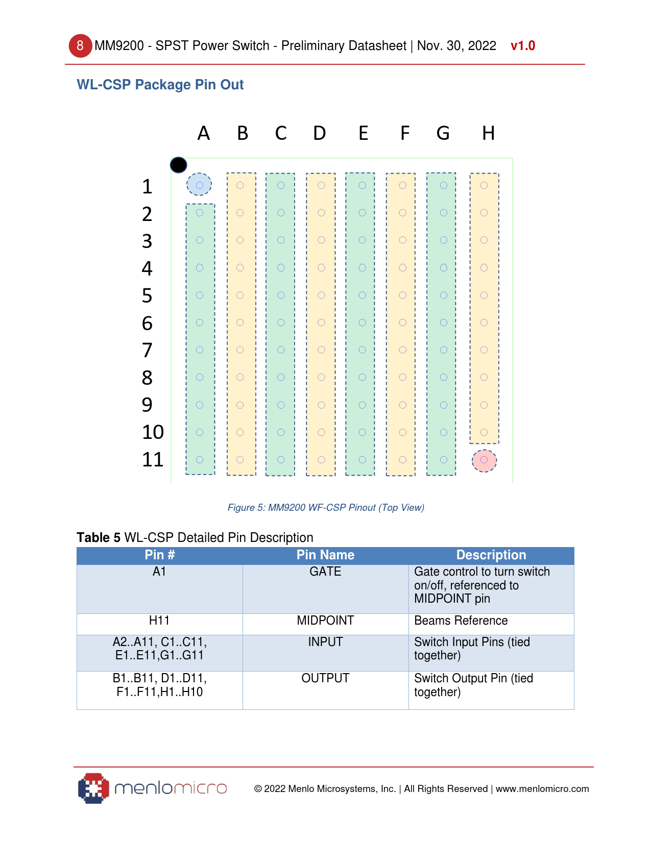 A1 GATE Gate control to turn switch on/off, referenced to MIDPOINT pin H11 MIDPOINT Beams Reference A2..A11, C1..C11, INPUT Switch Input Pins (tied E1..E11,G1..G11 together) B1..B11, D1..D11, OUTPUT Switch Output Pin (tied F1..F11,H1..H10 together) © 2022 Menlo Microsystems, Inc. | All Rights Reserved | www.menlomicro.com