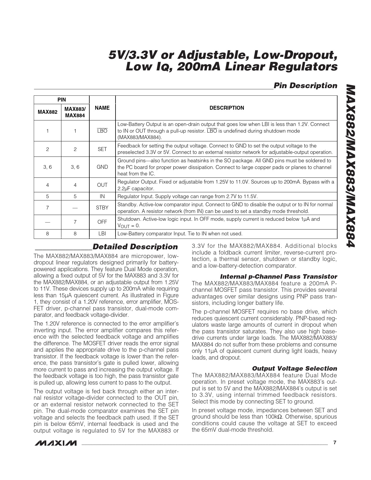 5V/3.3V or Adjustable, Low-Dropout,Low IQ, 200mA Linear RegulatorsMAX882/MAX883/MAX884Pin DescriptionPINMAX883/NAMEDESCRIPTIONMAX882MAX884 Low-Battery Output is an open-drain output that goes low when LBI is less than 1.2V. Connect 1 1 LBO to IN or OUT through a pull-up resistor. LBO is undefined during shutdown mode (MAX883/MAX884). Feedback for setting the output voltage. Connect to GND to set the output voltage to the 2 2 SET preselected 3.3V or 5V. Connect to an external resistor network for adjustable-output operation. Ground pins—also function as heatsinks in the SO package. All GND pins must be soldered to 3, 6 3, 6 GND the PC board for proper power dissipation. Connect to large copper pads or planes to channel heat from the IC. Regulator Output. Fixed or adjustable from 1.25V to 11.0V. Sources up to 200mA. Bypass with a 4 4 OUT 2.2µF capacitor. 5 5 IN Regulator Input. Supply voltage can range from 2.7V to 11.5V. Standby. Active-low comparator input. Connect to GND to disable the output or to IN for normal 7 — STBY operation. A resistor network (from IN) can be used to set a standby mode threshold. Shutdown. Active-low logic input. In OFF mode, supply current is reduced below 1µA and — 7 OFF VOUT = 0. 8 8 LBI Low-Battery comparator Input. Tie to IN when not used. _______________Detailed Description 3.3V for the MAX882/MAX884. Additional blocks include a foldback current limiter, reverse-current pro- The MAX882/MAX883/MAX884 are micropower, low- tection, a thermal sensor, shutdown or standby logic, dropout linear regulators designed primarily for battery- and a low-battery-detection comparator. powered applications. They feature Dual Mode operation, allowing a fixed output of 5V for the MAX883 and 3.3V for Internal p-Channel Pass Transistor the MAX882/MAX884, or an adjustable output from 1.25V The MAX882/MAX883/MAX884 feature a 200mA P- to 11V. These devices supply up to 200mA while requiring channel MOSFET pass transistor. This provides several less than 15µA quiescent current. As illustrated in Figure advantages over similar designs using PNP pass tran- 1, they consist of a 1.20V reference, error amplifier, MOS- sistors, including longer battery life. FET driver, p-channel pass transistor, dual-mode com- The p-channel MOSFET requires no base drive, which parator, and feedback voltage-divider. reduces quiescent current considerably. PNP-based reg- The 1.20V reference is connected to the error amplifier’s ulators waste large amounts of current in dropout when inverting input. The error amplifier compares this refer- the pass transistor saturates. They also use high base- ence with the selected feedback voltage and amplifies drive currents under large loads. The MAX882/MAX883/ the difference. The MOSFET driver reads the error signal MAX884 do not suffer from these problems and consume and applies the appropriate drive to the p-channel pass only 11µA of quiescent current during light loads, heavy transistor. If the feedback voltage is lower than the refer- loads, and dropout. ence, the pass transistor’s gate is pulled lower, allowing more current to pass and increasing the output voltage. If Output Voltage Selection the feedback voltage is too high, the pass transistor gate The MAX882/MAX883/MAX884 feature Dual Mode is pulled up, allowing less current to pass to the output. operation. In preset voltage mode, the MAX883’s out- put is set to 5V and the MAX882/MAX884’s output is set The output voltage is fed back through either an inter- to 3.3V, using internal trimmed feedback resistors. nal resistor voltage-divider connected to the OUT pin, Select this mode by connecting SET to ground. or an external resistor network connected to the SET pin. The dual-mode comparator examines the SET pin In preset voltage mode, impedances between SET and voltage and selects the feedback path used. If the SET ground should be less than 100kΩ. Otherwise, spurious pin is below 65mV, internal feedback is used and the conditions could cause the voltage at SET to exceed output voltage is regulated to 5V for the MAX883 or the 65mV dual-mode threshold. _______________________________________________________________________________________7