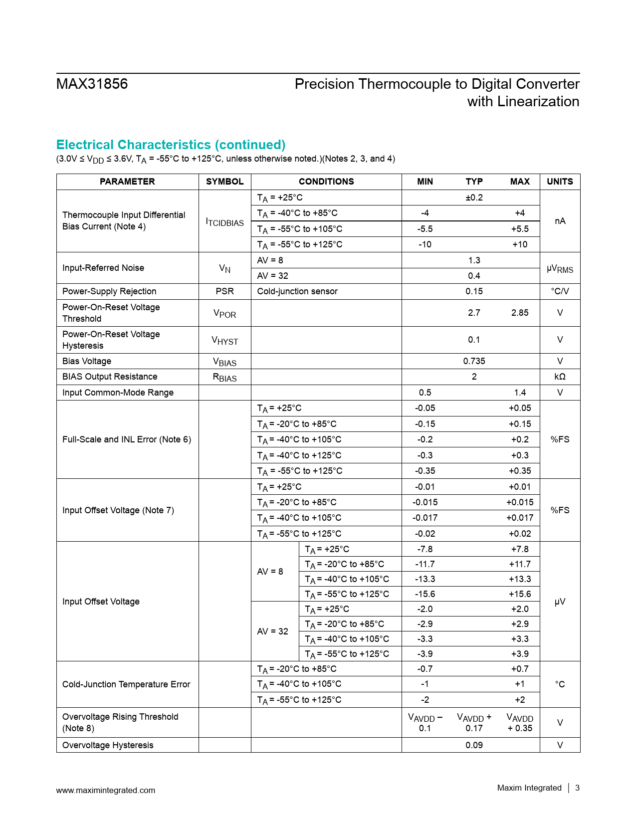 TA = +25°C ±0.2 Thermocouple Input Differential TA = -40°C to +85°C -4 +4 Bias Current (Note 4) ITCIDBIAS nA TA = -55°C to +105°C -5.5 +5.5 TA = -55°C to +125°C -10 +10 AV = 8 1.3 Input-Referred Noise VN µVRMS AV = 32 0.4 Power-Supply Rejection PSR Cold-junction sensor 0.15 °C/V Power-On-Reset Voltage Threshold VPOR 2.7 2.85 V Power-On-Reset Voltage Hysteresis VHYST 0.1 V Bias Voltage VBIAS 0.735 V BIAS Output Resistance RBIAS 2 kΩ Input Common-Mode Range 0.5 1.4 V TA = +25°C -0.05 +0.05 TA = -20°C to +85°C -0.15 +0.15 Full-Scale and INL Error (Note 6) TA = -40°C to +105°C -0.2 +0.2 %FS TA = -40°C to +125°C -0.3 +0.3 TA = -55°C to +125°C -0.35 +0.35 TA = +25°C -0.01 +0.01 T = -20°C to +85°C -0.015 +0.015 Input Offset Voltage (Note 7) A %FS TA = -40°C to +105°C -0.017 +0.017 TA = -55°C to +125°C -0.02 +0.02 TA = +25°C -7.8 +7.8 T = -20°C to +85°C -11.7 +11.7 AV = 8 A TA = -40°C to +105°C -13.3 +13.3 T = -55°C to +125°C -15.6 +15.6 Input Offset Voltage A µV TA = +25°C -2.0 +2.0 T = -20°C to +85°C -2.9 +2.9 AV = 32 A TA = -40°C to +105°C -3.3 +3.3 TA = -55°C to +125°C -3.9 +3.9 TA = -20°C to +85°C -0.7 +0.7 Cold-Junction Temperature Error TA = -40°C to +105°C -1 +1 °C TA = -55°C to +125°C -2 +2 Overvoltage Rising Threshold VAVDD – VAVDD + VAVDD (Note 8) 0.1 0.17 + 0.35 V Overvoltage Hysteresis 0.09 V www.maximintegrated.com Maxim Integrated │ 3