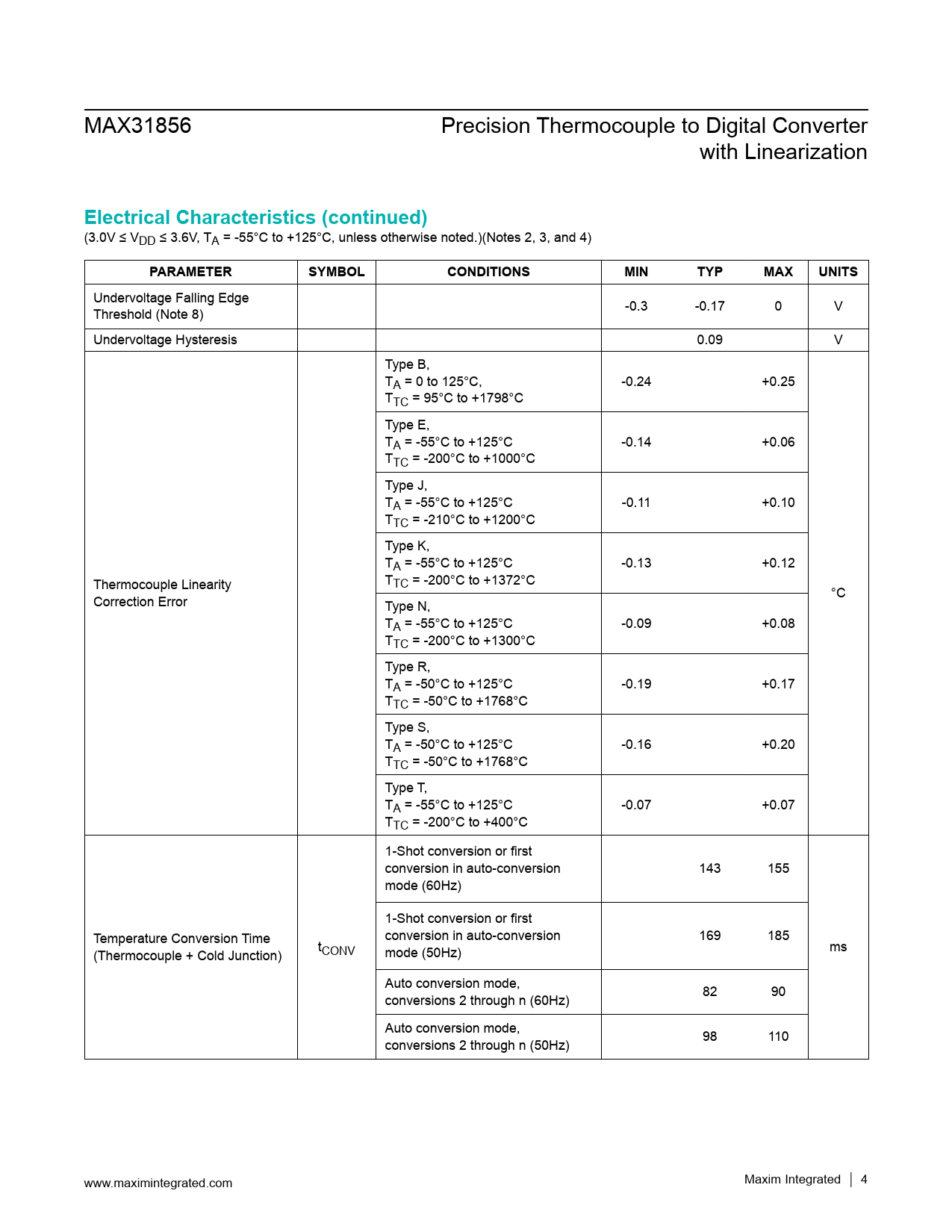 Undervoltage Falling Edge Threshold (Note 8) -0.3 -0.17 0 V Undervoltage Hysteresis 0.09 V Type B, TA = 0 to 125°C, -0.24 +0.25 TTC = 95°C to +1798°C Type E, TA = -55°C to +125°C -0.14 +0.06 TTC = -200°C to +1000°C Type J, TA = -55°C to +125°C -0.11 +0.10 TTC = -210°C to +1200°C Type K, TA = -55°C to +125°C -0.13 +0.12 Thermocouple Linearity TTC = -200°C to +1372°C Correction Error °C Type N, TA = -55°C to +125°C -0.09 +0.08 TTC = -200°C to +1300°C Type R, TA = -50°C to +125°C -0.19 +0.17 TTC = -50°C to +1768°C Type S, TA = -50°C to +125°C -0.16 +0.20 TTC = -50°C to +1768°C Type T, TA = -55°C to +125°C -0.07 +0.07 TTC = -200°C to +400°C 1-Shot conversion or first conversion in auto-conversion 143 155 mode (60Hz) 1-Shot conversion or first Temperature Conversion Time conversion in auto-conversion 169 185 (Thermocouple + Cold Junction) tCONV ms mode (50Hz) Auto conversion mode, conversions 2 through n (60Hz) 82 90 Auto conversion mode, conversions 2 through n (50Hz) 98 110 www.maximintegrated.com Maxim Integrated │ 4