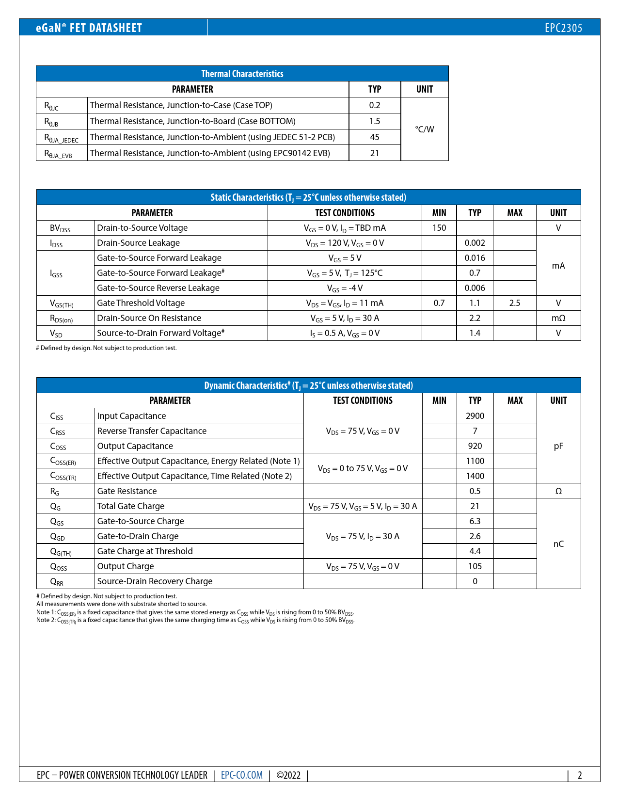 CISS Input Capacitance 2900 CRSS Reverse Transfer Capacitance VDS = 75 V, VGS = 0 V 7 COSS Output Capacitance 920 pF COSS(ER) Effective Output Capacitance, Energy Related (Note 1) 1100 VDS = 0 to 75 V, VGS = 0 V COSS(TR) Effective Output Capacitance, Time Related (Note 2) 1400 RG Gate Resistance 0.5 Ω QG Total Gate Charge VDS = 75 V, VGS = 5 V, ID = 30 A 21 QGS Gate-to-Source Charge 6.3 QGD Gate-to-Drain Charge VDS = 75 V, ID = 30 A 2.6 nC QG(TH) Gate Charge at Threshold 4.4 QOSS Output Charge VDS = 75 V, VGS = 0 V 105 QRR Source-Drain Recovery Charge 0 # Defined by design. Not subject to production test. All measurements were done with substrate shorted to source. Note 1: COSS(ER) is a fixed capacitance that gives the same stored energy as COSS while VDS is rising from 0 to 50% BVDSS. Note 2: COSS(TR) is a fixed capacitance that gives the same charging time as COSS while VDS is rising from 0 to 50% BVDSS. EPC – POWER CONVERSION TECHNOLOGY LEADER | EPC-CO.COM | ©2022 | | 2