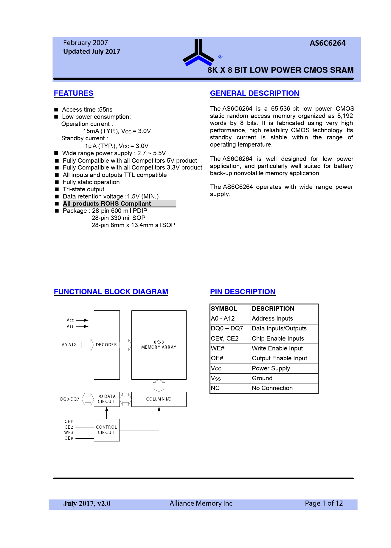 February 2007. AS6C6264. Updated July 2017. 8K X 8 BIT LOW POWER CMOS SRAM. FEATURES. GENERAL DESCRIPTION