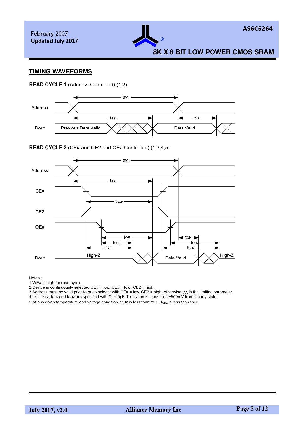 AS6C6264February 2007®Updated July 20178K X 8 BIT LOW POWER CMOS SRAMTIMING WAVEFORMSREAD CYCLE 1 (Address Controlled) (1,2) tRC Address tAA tOH Dout Previous Data Valid Data Valid READ CYCLE 2 (CE# and CE2 and OE# Controlled) (1,3,4,5) tRC Address tAA CE# tACE CE2 OE# tOE tOH tOLZ tOHZ tCLZ tCHZ Dout High-Z Data Valid High-Z Notes : 1.WE# is high for read cycle. 2.Device is continuously selected OE# = low, CE# = low., CE2 = high. 3.Address must be valid prior to or coincident with CE# = low, CE2 = high; otherwise tAA is the limiting parameter. 4.tCLZ, tOLZ, tCHZ and tOHZ are specified with CL = 5pF. Transition is measured ±500mV from steady state. 5.At any given temperature and voltage condition, tCHZ is less than tCLZ , tOHZ is less than tOLZ. Page 5 of 12July 2017, v2.0Alliance Memory Inc