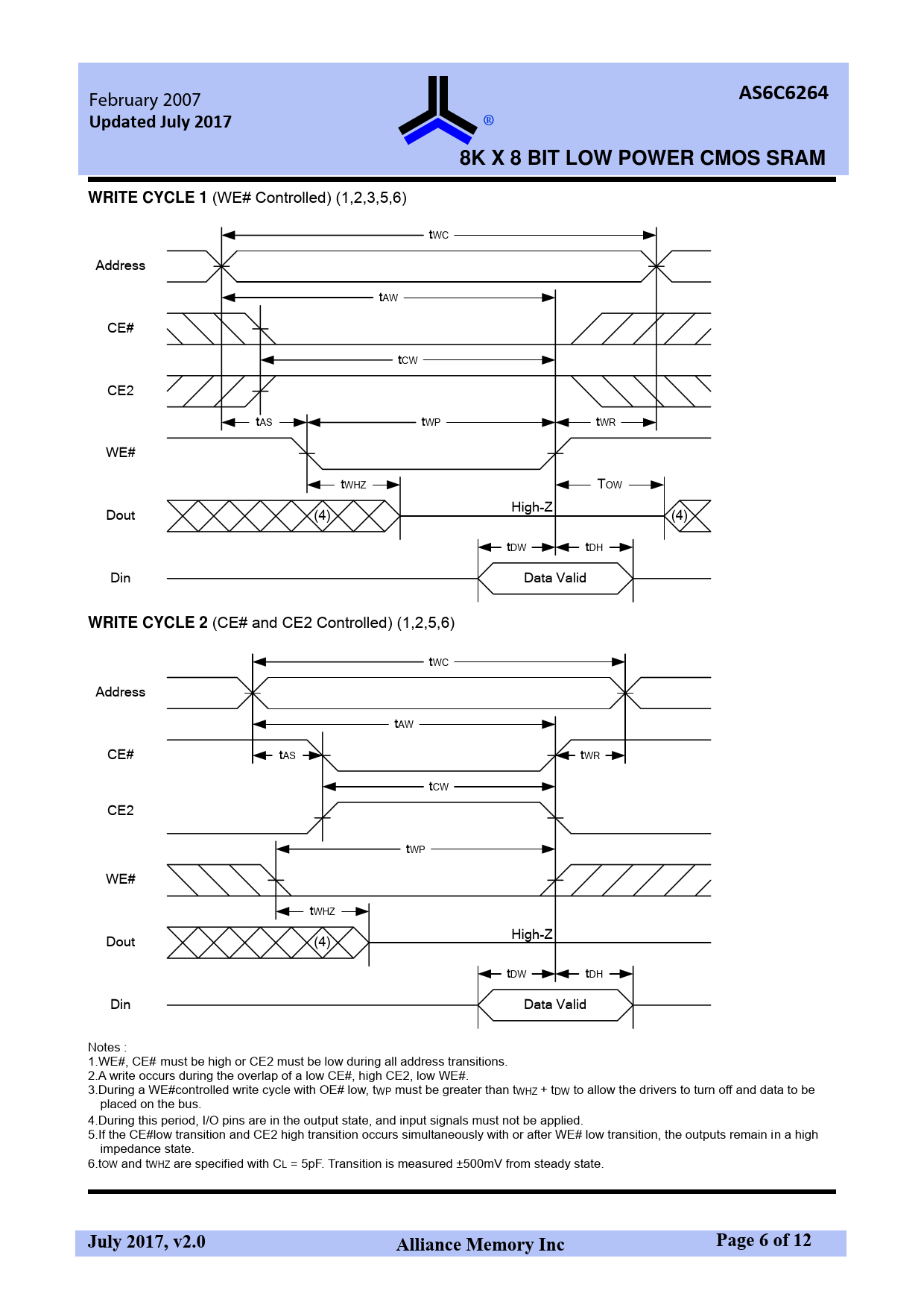 February 2007AS6C6264®Updated July 20178K X 8 BIT LOW POWER CMOS SRAMWRITE CYCLE 1 (WE# Controlled) (1,2,3,5,6) tWC Address tAW CE# tCW CE2 tAS tWP tWR WE# tWHZ TOW High-Z Dout (4) (4) tDW tDH Din Data Valid WRITE CYCLE 2 (CE# and CE2 Controlled) (1,2,5,6) tWC Address tAW CE# tAS tWR tCW CE2 tWP WE# tWHZ High-Z Dout (4) tDW tDH Din Data Valid Notes : 1.WE#, CE# must be high or CE2 must be low during all address transitions. 2.A write occurs during the overlap of a low CE#, high CE2, low WE#. 3.During a WE#controlled write cycle with OE# low, tWP must be greater than tWHZ + tDW to allow the drivers to turn off and data to be placed on the bus. 4.During this period, I/O pins are in the output state, and input signals must not be applied. 5.If the CE#low transition and CE2 high transition occurs simultaneously with or after WE# low transition, the outputs remain in a high impedance state. 6.tOW and tWHZ are specified with CL = 5pF. Transition is measured ±500mV from steady state. July 2017, v2.0Alliance Memory IncPage 6 of 12
