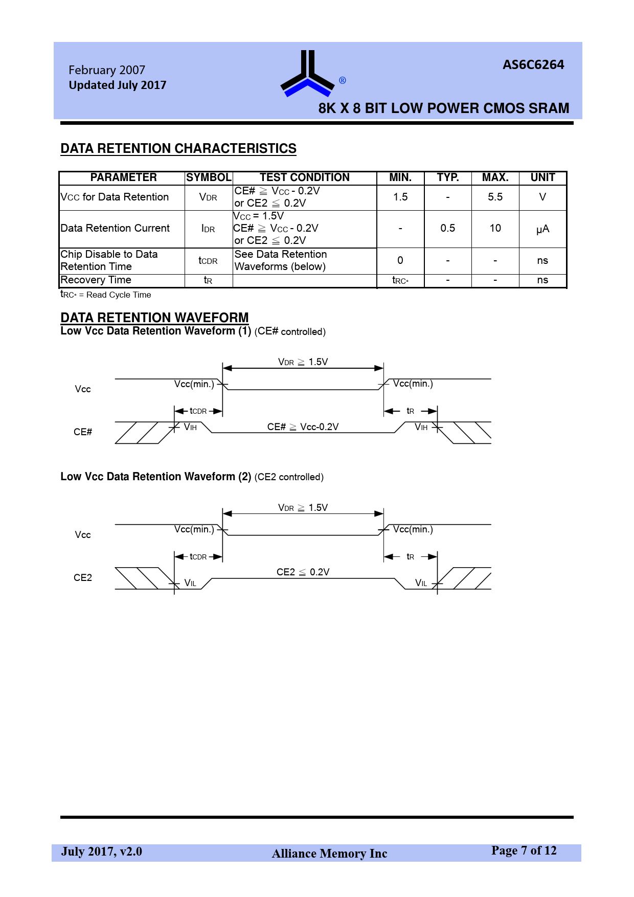 February 2007. AS6C6264. Updated July 2017. 8K X 8 BIT LOW POWER CMOS SRAM. DATA RETENTION CHARACTERISTICS. PARAMETER. SYMBOL