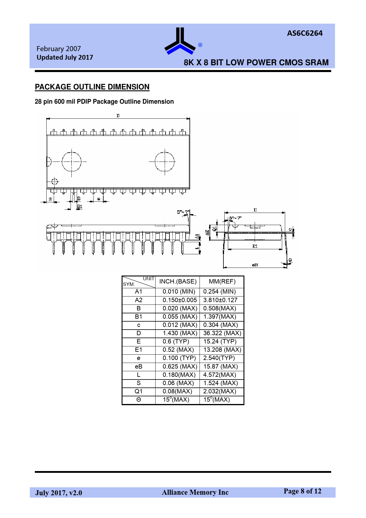 AS6C6264. February 2007. Updated July 2017. 8K X 8 BIT LOW POWER CMOS SRAM. PACKAGE OUTLINE DIMENSION