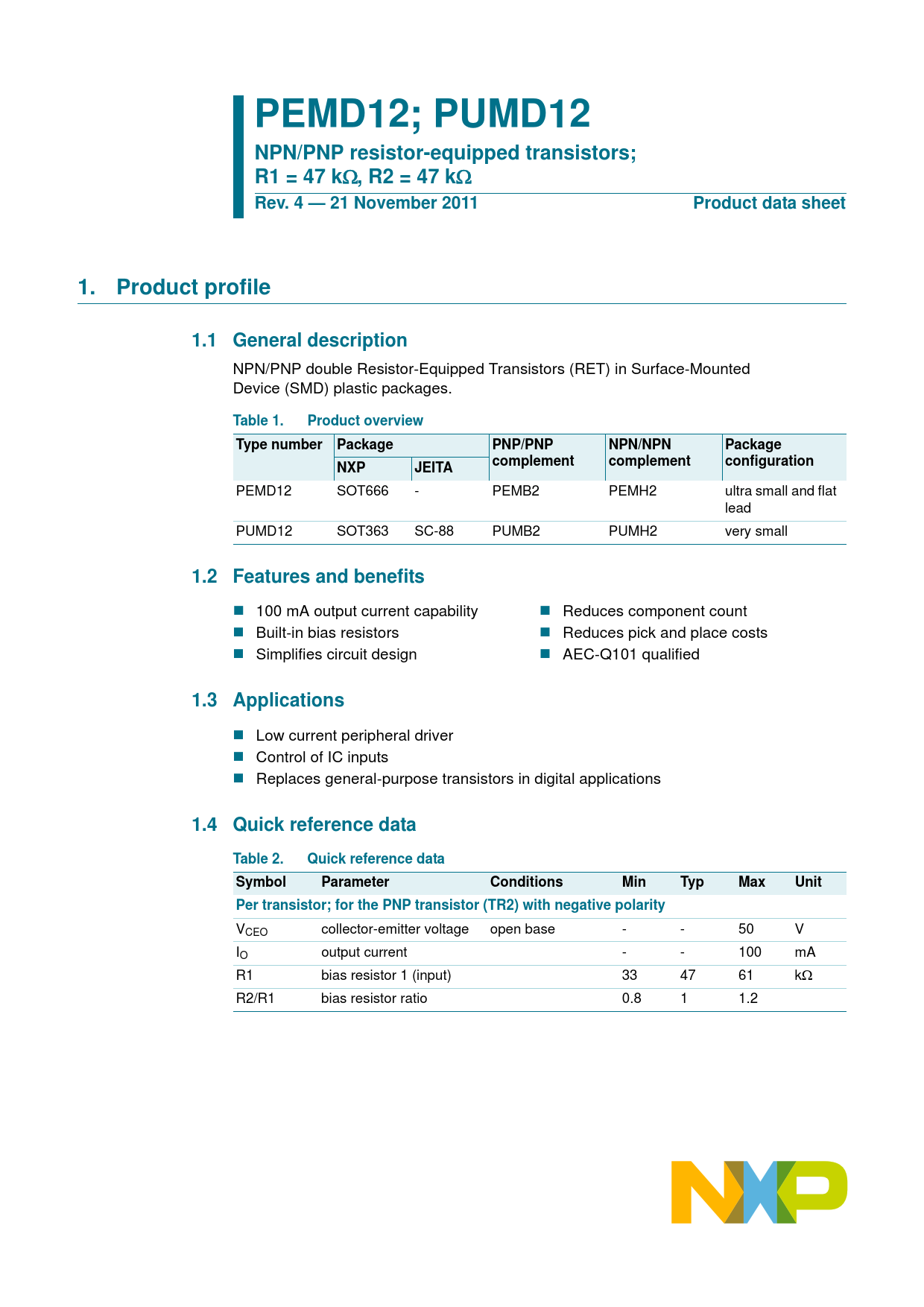 PEMD12; PUMD12 NPN/PNP resistor-equipped transistors; R1 = 47 k. , R2 = 47 k. Rev. 4 — 21 November 2011. Product data sheet