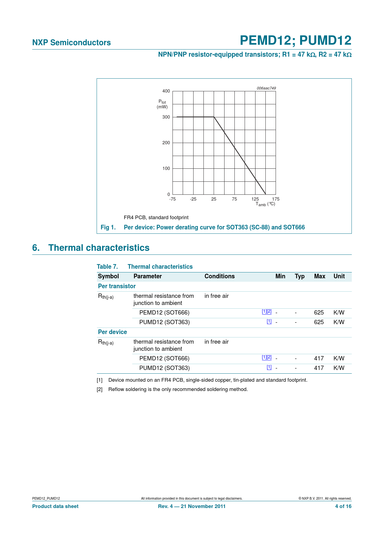 Rth(j-a) thermal resistance from in free air junction to ambient PEMD12 (SOT666) [1][2] - - 417 K/W PUMD12 (SOT363) [1] - - 417 K/W [1] Device mounted on an FR4 PCB, single-sided copper, tin-plated and standard footprint. [2] Reflow soldering is the only recommended soldering method. PEMD12_PUMD12 All information provided in this document is subject to legal disclaimers. © NXP B.V. 2011. All rights reserved.