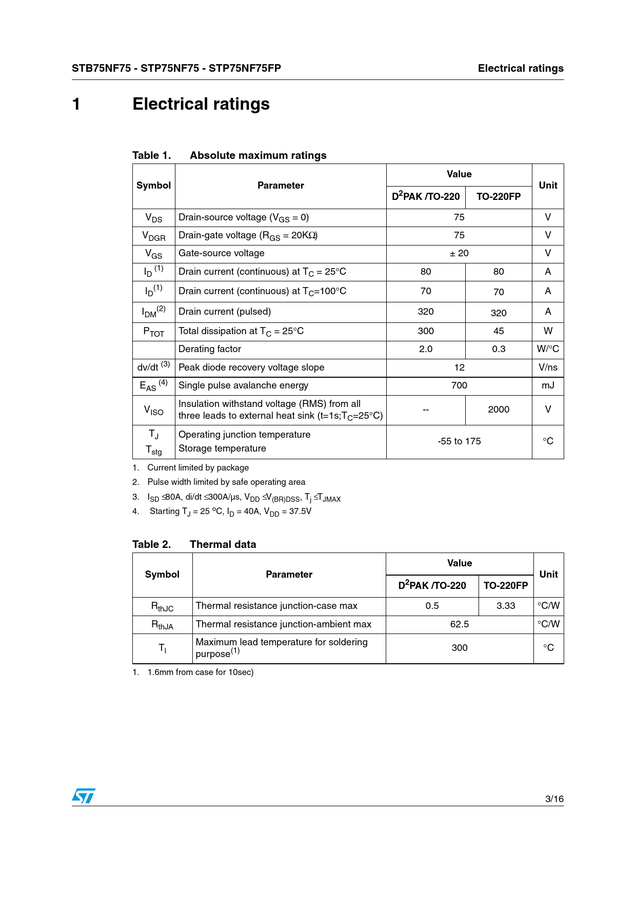 Pages / Page16 / 3 — STB75NF75 - STP75NF75 - STP75NF75FP. Electrical ratings. 1 Electrical. …