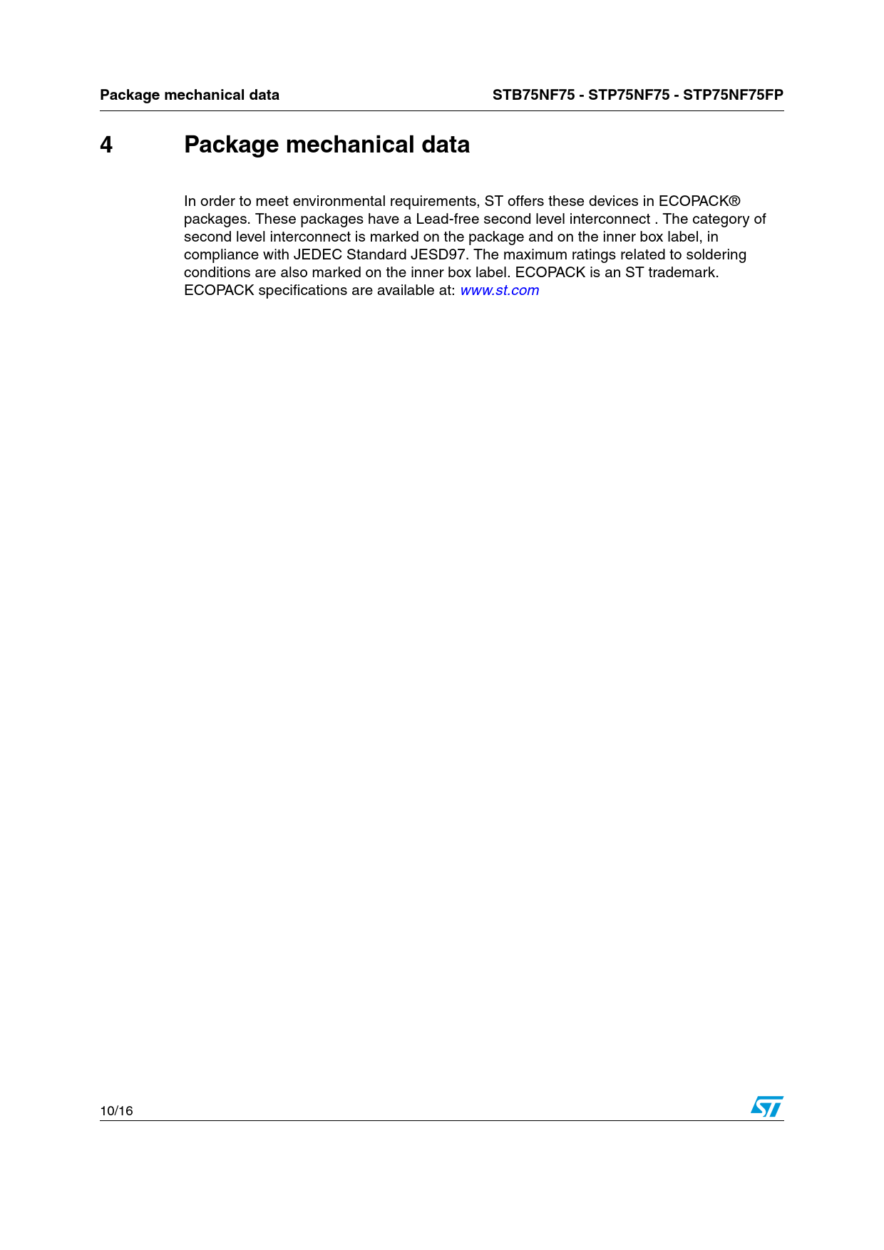 Package mechanical dataSTB75NF75 - STP75NF75 - STP75NF75FP4Package mechanical data In order to meet environmental requirements, ST offers these devices in ECOPACK® packages. These packages have a Lead-free second level interconnect . The category of second level interconnect is marked on the package and on the inner box label, in compliance with JEDEC Standard JESD97. The maximum ratings related to soldering conditions are also marked on the inner box label. ECOPACK is an ST trademark. ECOPACK specifications are available at: www.st.com 10/16 Document Outline 1 Electrical ratings 2 Electrical characteristics 2.1 Electrical characteristics (curves) 3 Test circuit 4 Package mechanical data 5 Packaging mechanical data 6 Revision history