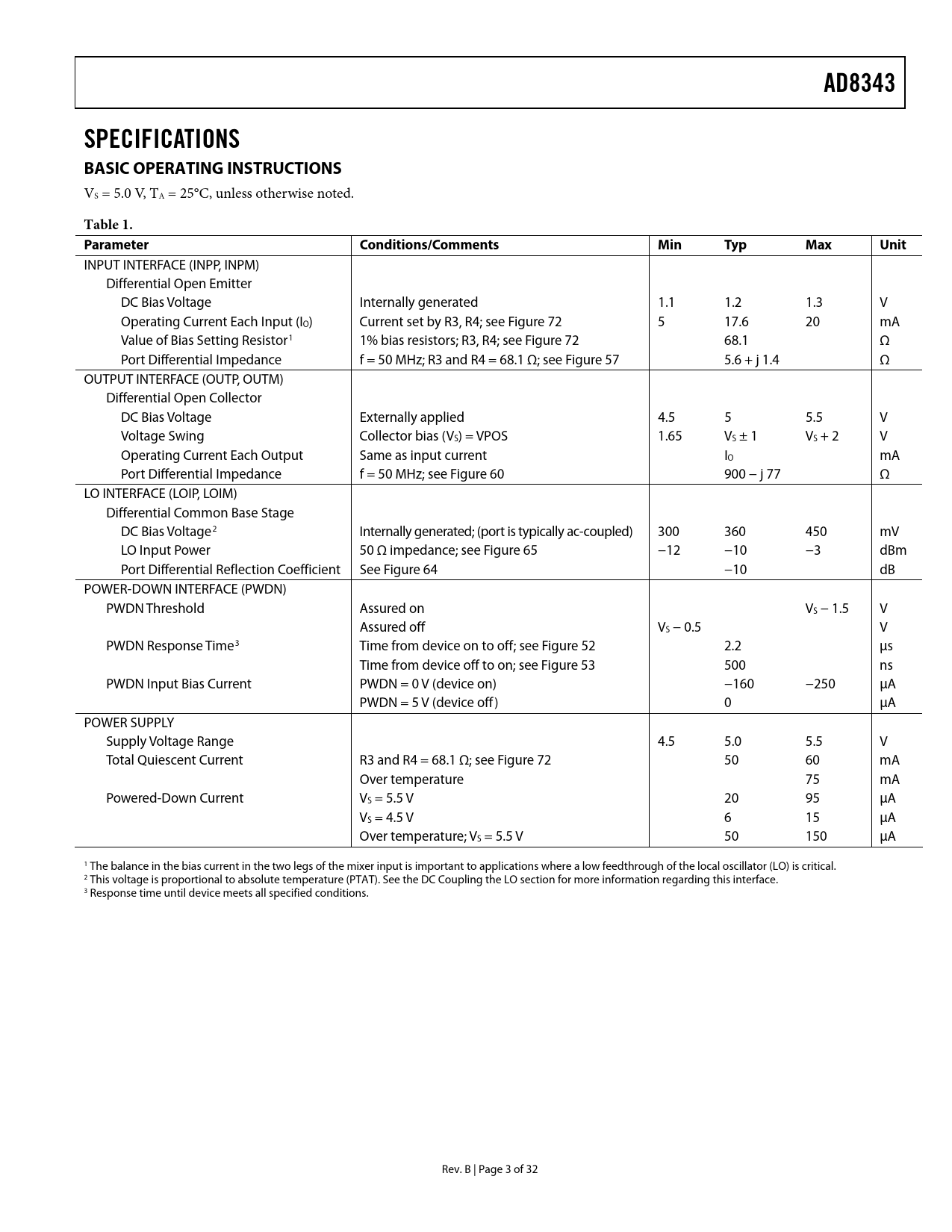 AD8343 SPECIFICATIONS BASIC OPERATING INSTRUCTIONS Table 1 Parameter Conditions/Comments Min Typ Max Unit