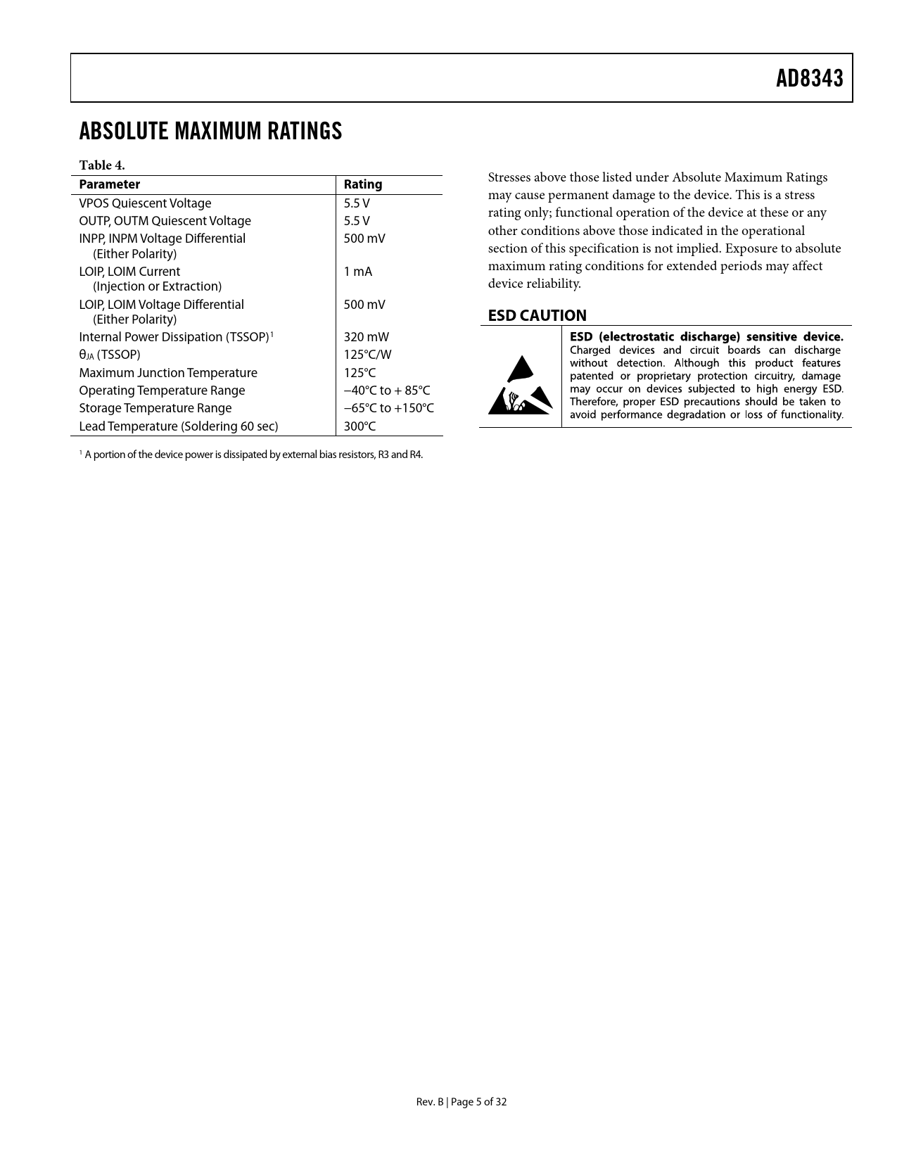 Pages / Page32 / 5 — AD8343. ABSOLUTE MAXIMUM RATINGS. Table 4. Parameter Rating. ESD CAUTION