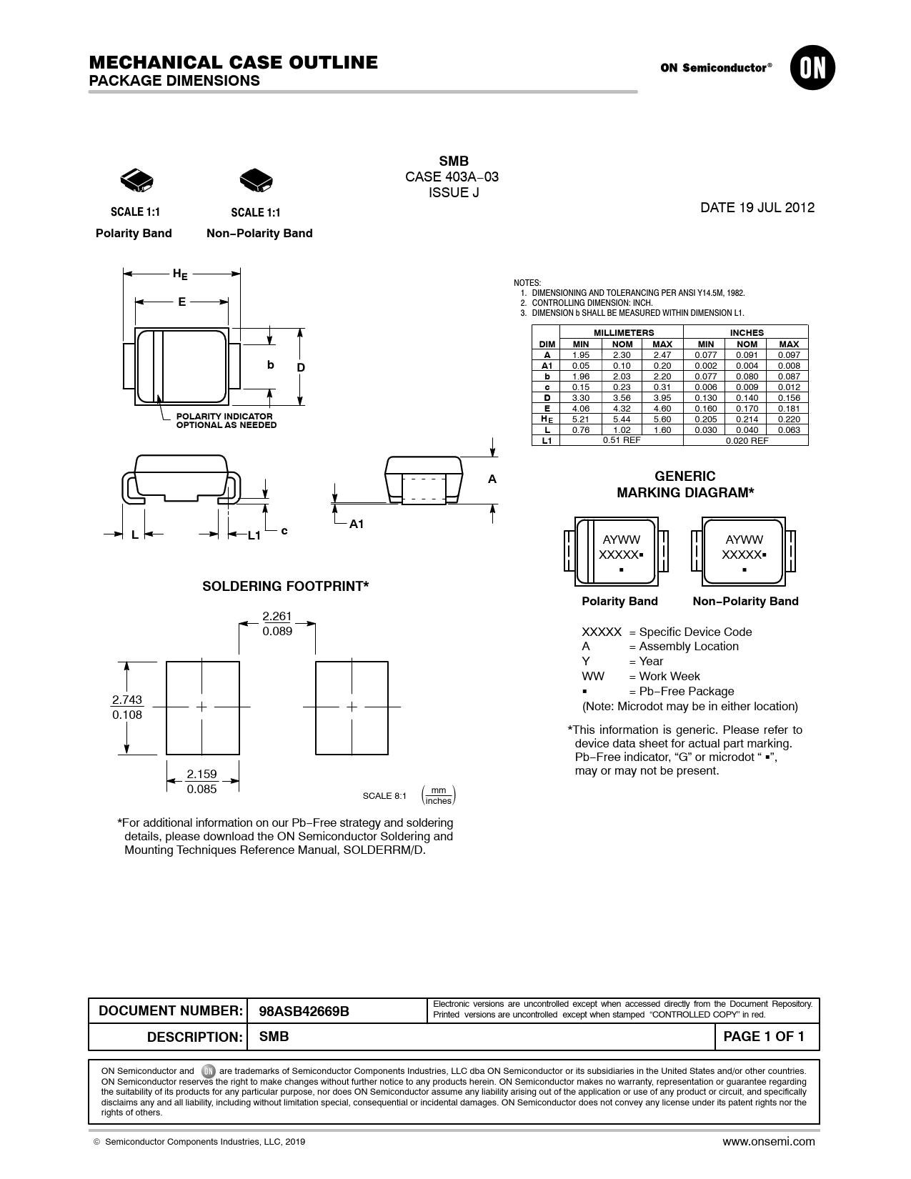 PACKAGE DIMENSIONS. SMB. SCALE 1:1. Polarity Band. Non−Polarity Band. MILLIMETERS. INCHES. DIM. MIN. NOM. MAX. POLARITY INDICATOR