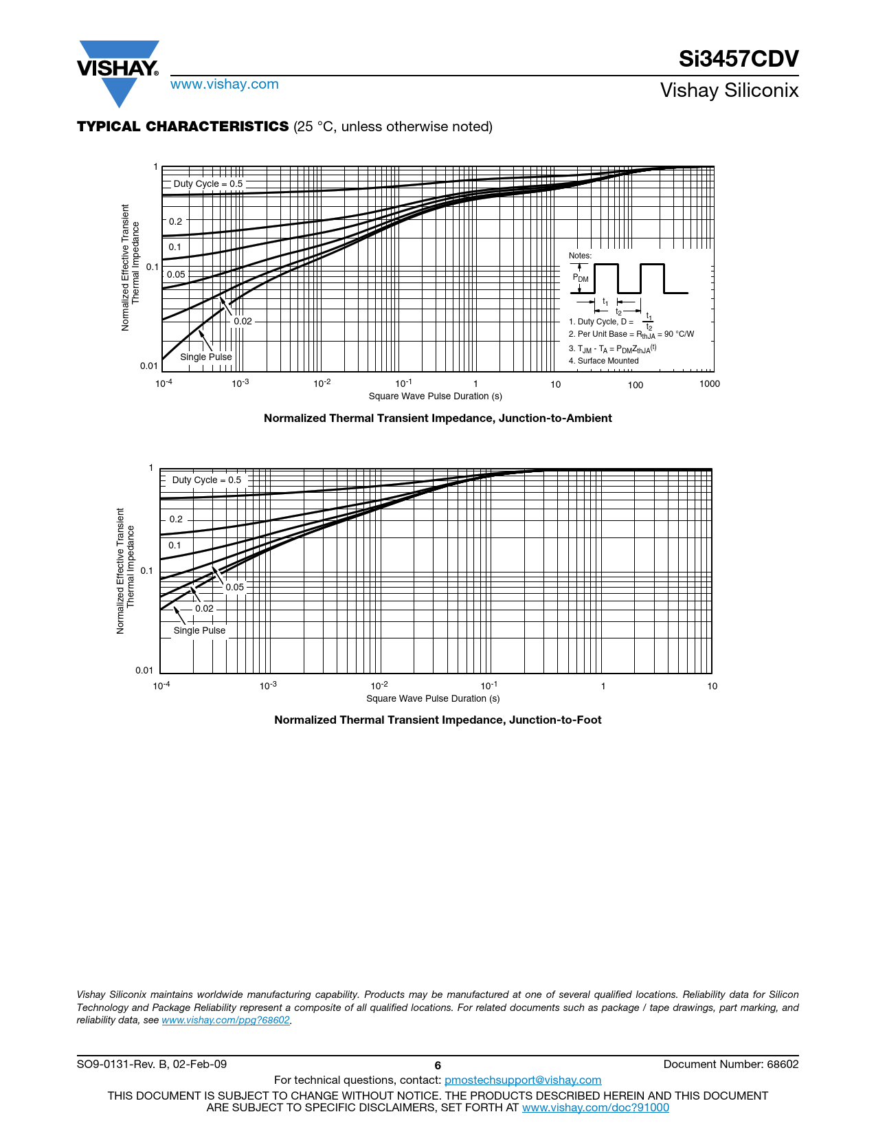 Si3457CDV www.vishay.com Vishay Siliconix TYPICAL CHARACTERISTICS (25 °C, unless otherwise noted) 1 Duty Cycle = 0.5 0.2 ransient T 0.1 Notes: Impedance fective 0.1 0.05 Ef PDM Thermal t1 t2 t1 0.02 1. Duty Cycle, D = Normalized t2 2. Per Unit Base = RthJA = 90 °C/W 3. T (t) JM - TA = PDMZthJA Single Pulse 4. Surface Mounted 0.01 10-3 10-2 10-1 10-4 1 10 100 1000 Square Wave Pulse Duration (s) Normalized Thermal Transient Impedance, Junction-to-Ambient 1 Duty Cycle = 0.5 0.2 ransient T 0.1 Impedance fective 0.1 Ef 0.05 Thermal 0.02 Normalized Single Pulse 0.01 10-3 10-2 10-1 10-4 1 0 1 Square Wave Pulse Duration (s) Normalized Thermal Transient Impedance, Junction-to-Foot Vishay Siliconix maintains worldwide manufacturing capability. Products may be manufactured at one of several qualified locations. Reliability data for Silicon Technology and Package Reliability represent a composite of all qualified locations. For related documents such as package / tape drawings, part marking, and reliability data, see www.vishay.com/ppg?68602. SO9-0131-Rev. B, 02-Feb-09 6 Document Number: 68602 For technical questions, contact: pmostechsupport@vishay.com THIS DOCUMENT IS SUBJECT TO CHANGE WITHOUT NOTICE. THE PRODUCTS DESCRIBED HEREIN AND THIS DOCUMENT ARE SUBJECT TO SPECIFIC DISCLAIMERS, SET FORTH AT www.vishay.com/doc?91000
